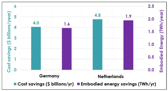 Financial and embodied energy savings if the United States had the same state of water infrastructure as that of Germany or The Netherlands.