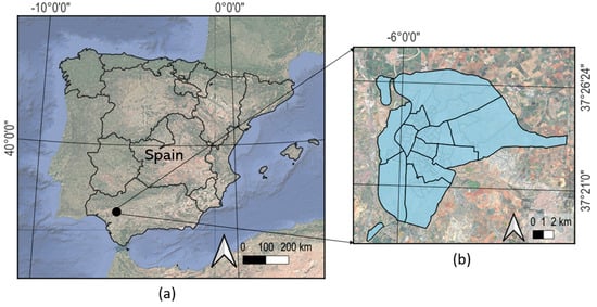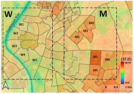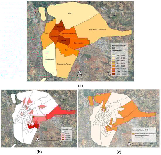 - Zone M: A district with high vulnerability and dense built-up morphology, and highest population density in Seville.