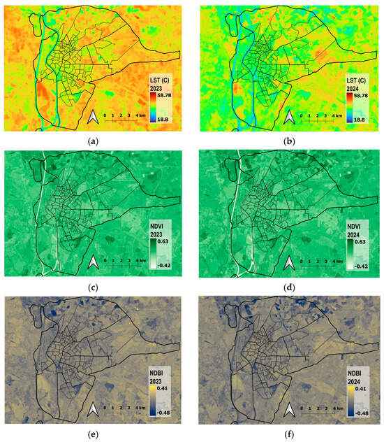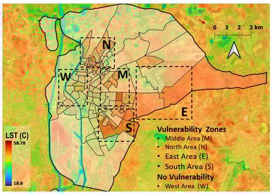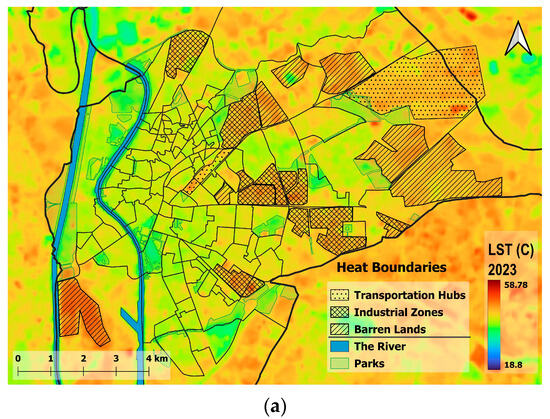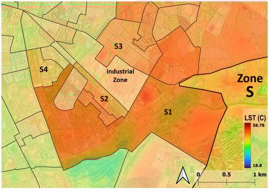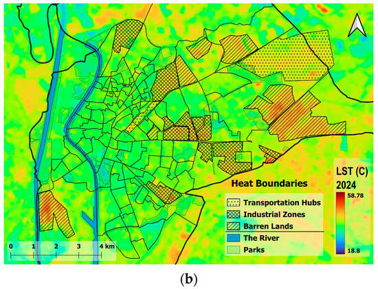 3.1.1. Highest Diurnal LST Values Are in the Peripheries