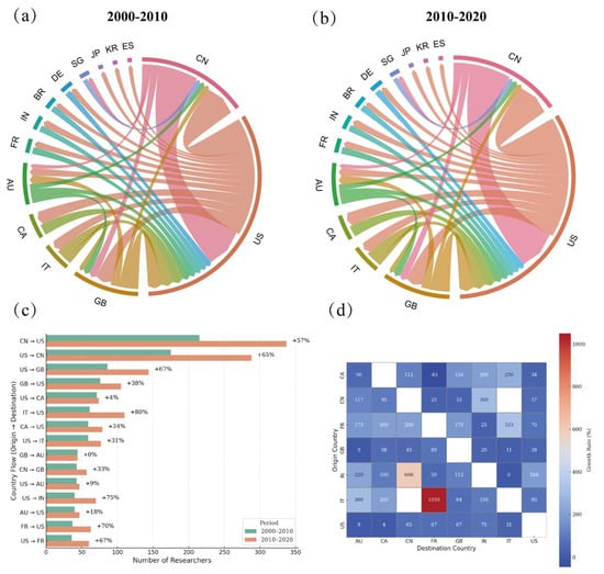 Global Inter-Country Researcher Mobility in the Smart City Domain. (a,b) Chord diagrams of inter-country researcher flows for 2000–2010 and 2010–2020, respectively; chord thickness indicates flow volume (c). Top 15 bilateral flows by volume in each decade (two bars per pair) with the percentage change annotated (d). Growth-rate heatmap of bilateral flows (row = origin, column = destination): each cell reports the percentage growth from 2000–2010 to 2010–2020. Warmer colors denote faster growth; cooler/negative values indicate declines; diagonal cells are not applicable. Country abbreviations follow ISO Alpha-2 codes (examples used here: AU = Australia; CA = Canada; CN = China; FR = France; GB = United Kingdom; IN = India; IT = Italy; US = United States).