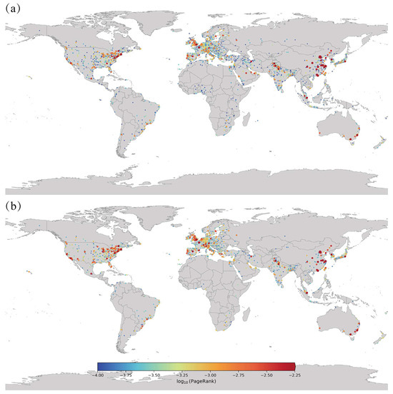 Spatiotemporal Evolution of City Centrality in the Global Researcher Mobility Network (2000–2020). (a) PageRank distribution of cities from 2000 to 2010; (b) PageRank distribution from 2010 to 2020. Node color indicates log-transformed PageRank scores, with warmer colors representing structurally central cities in the global mobility network.