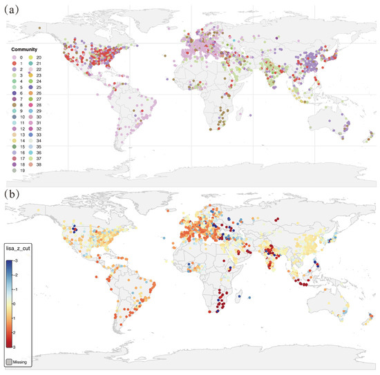 To examine whether these modular structures also align geographically, we conducted a LISA-based spatial autocorrelation analysis (Figure 4b). The global Moran’s I value of 0.163 (p < 2.2 × 10−16, Table 1) confirms significant spatial clustering, indicating that institutions in the same community are often geographically proximate. This reflects the territoriality of smart city knowledge systems, where regionally clustered cities share infrastructure standards, policy frameworks, and urban experimentation logics. Hotspot regions (high–high clusters) are observed in South Asia, Eastern Europe, and Southeastern Africa—regions actively promoting smart urban transformation through policy initiatives or donor-led development programs. In contrast, coldspots (low–low clusters) in Western Europe and East Asia reflect institutional differentiation and globally dispersed mobility preferences, typical of competitive, globally networked research environments. These findings reveal a hybrid spatial logic within global smart city research mobility. Some communities are territorially bounded and policy-integrated, while others transcend geography, anchored instead by shared technological paradigms or reputational affinity. This dual structure underscores the importance of both geographical embeddedness and network centrality in shaping the mobility of smart city researchers.