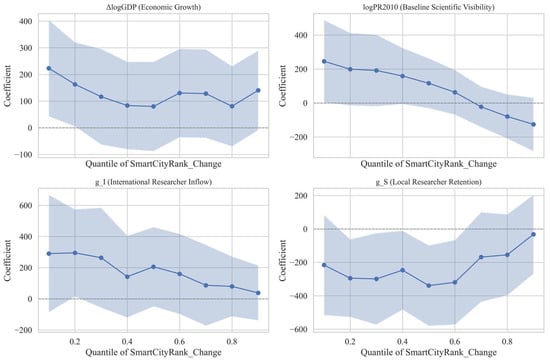 To explore the heterogeneity in the effects of explanatory variables across the distribution of smart city ranking changes, quantile regressions were estimated at nine deciles (0.1 to 0.9), with 1000 bootstrap replications to obtain robust confidence intervals under potential heteroskedasticity.