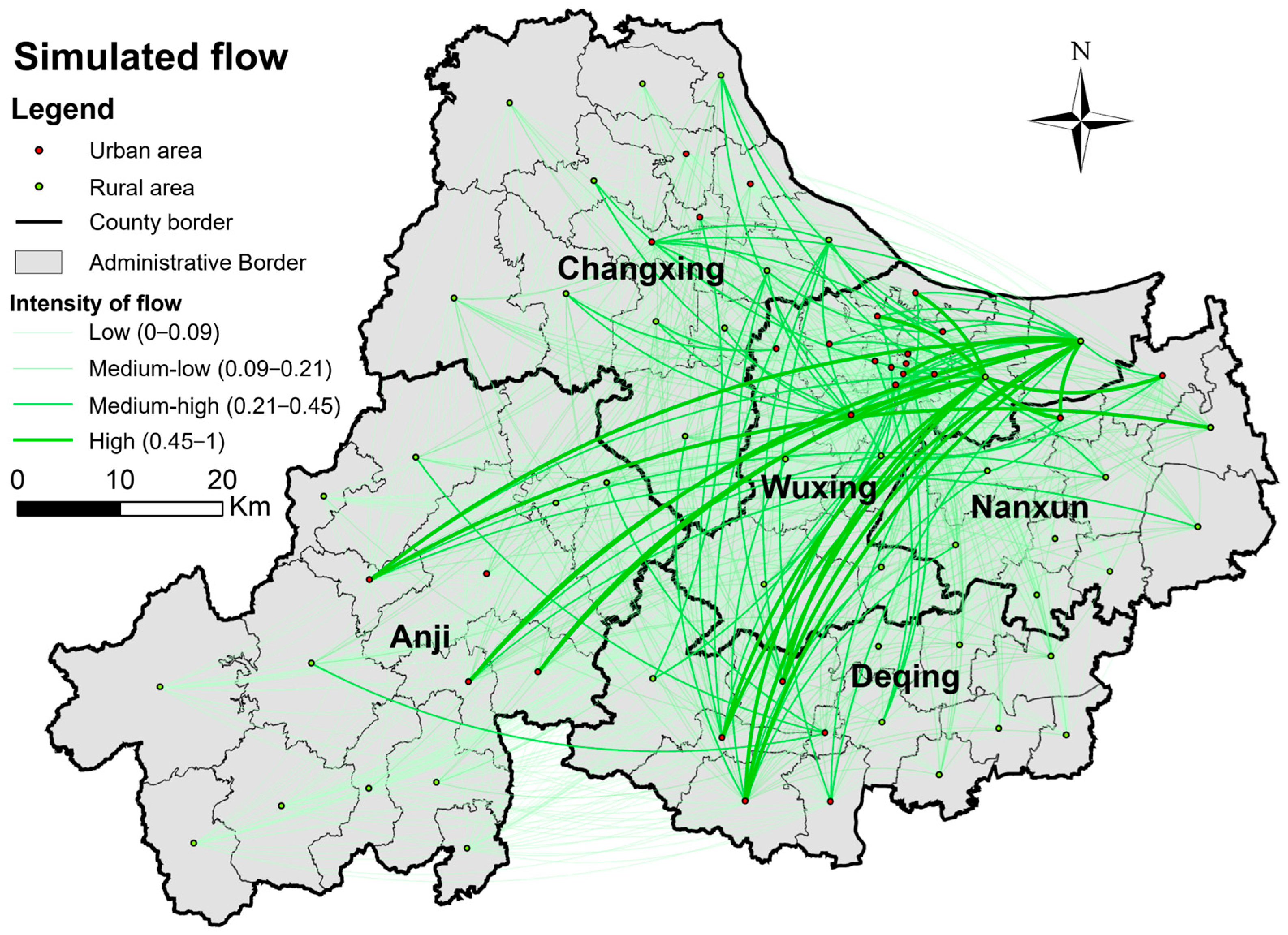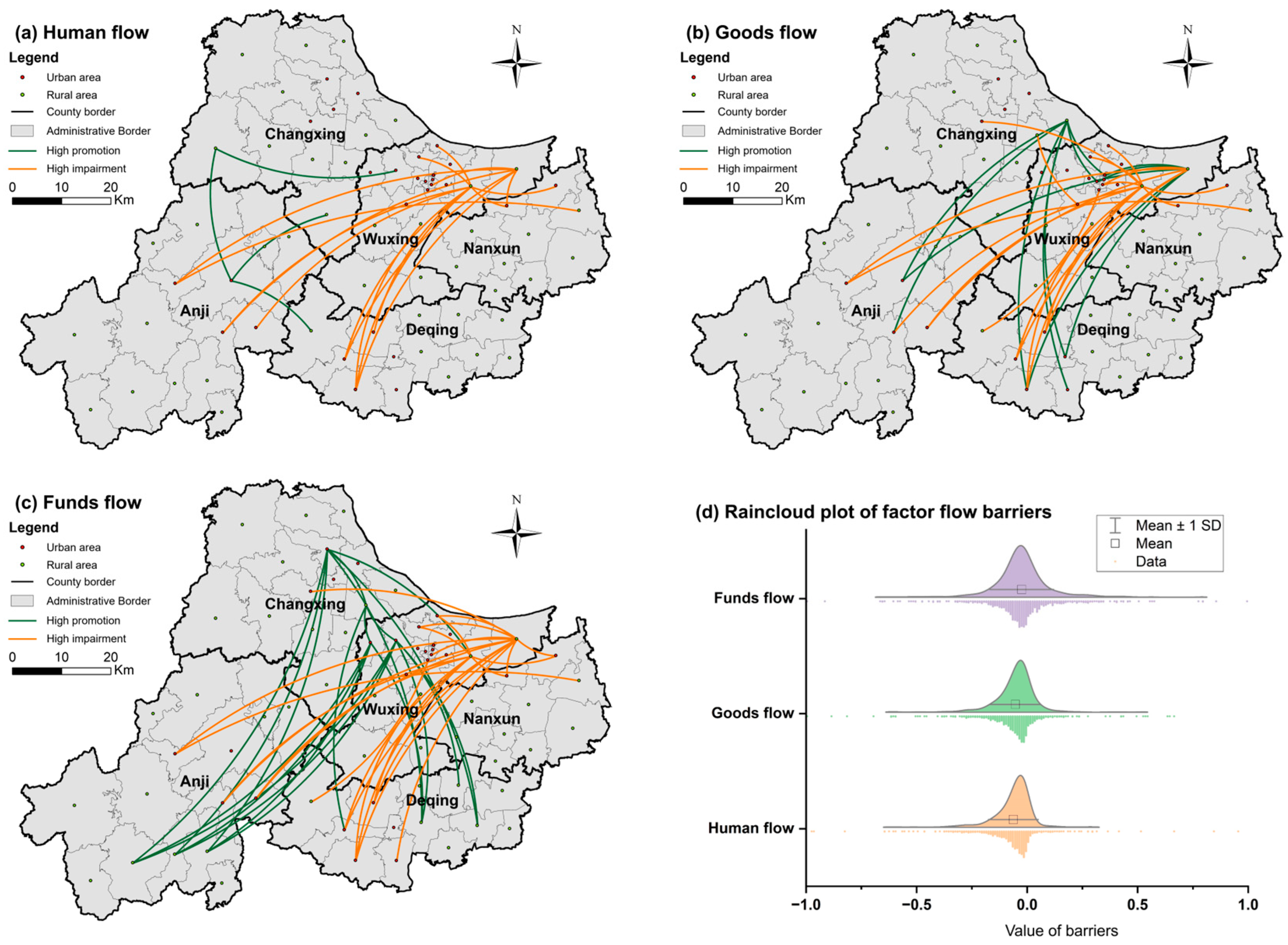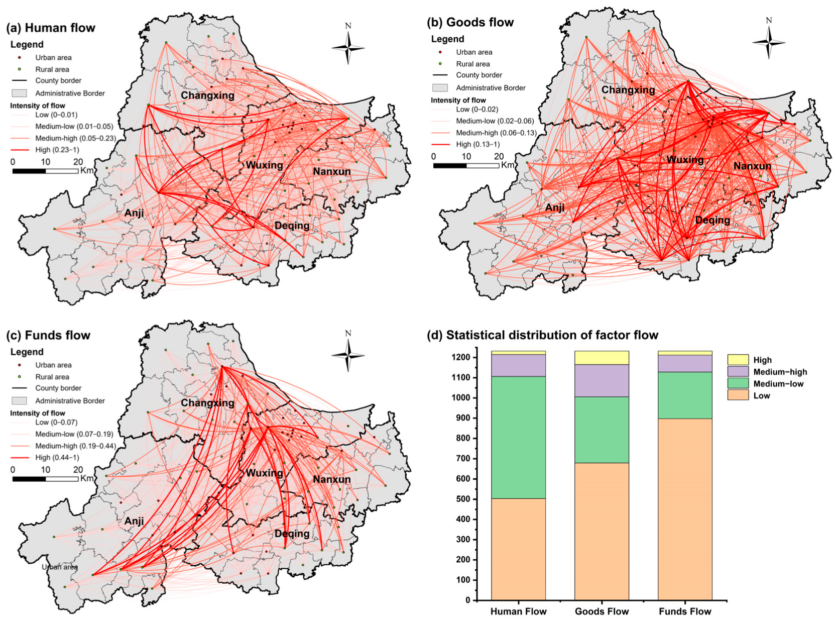 - Urban–rural factor flows in Huzhou exhibit a heterogeneous core–periphery structure, spatially modulated by metropolitan spillovers from Hangzhou and Suzhou.
