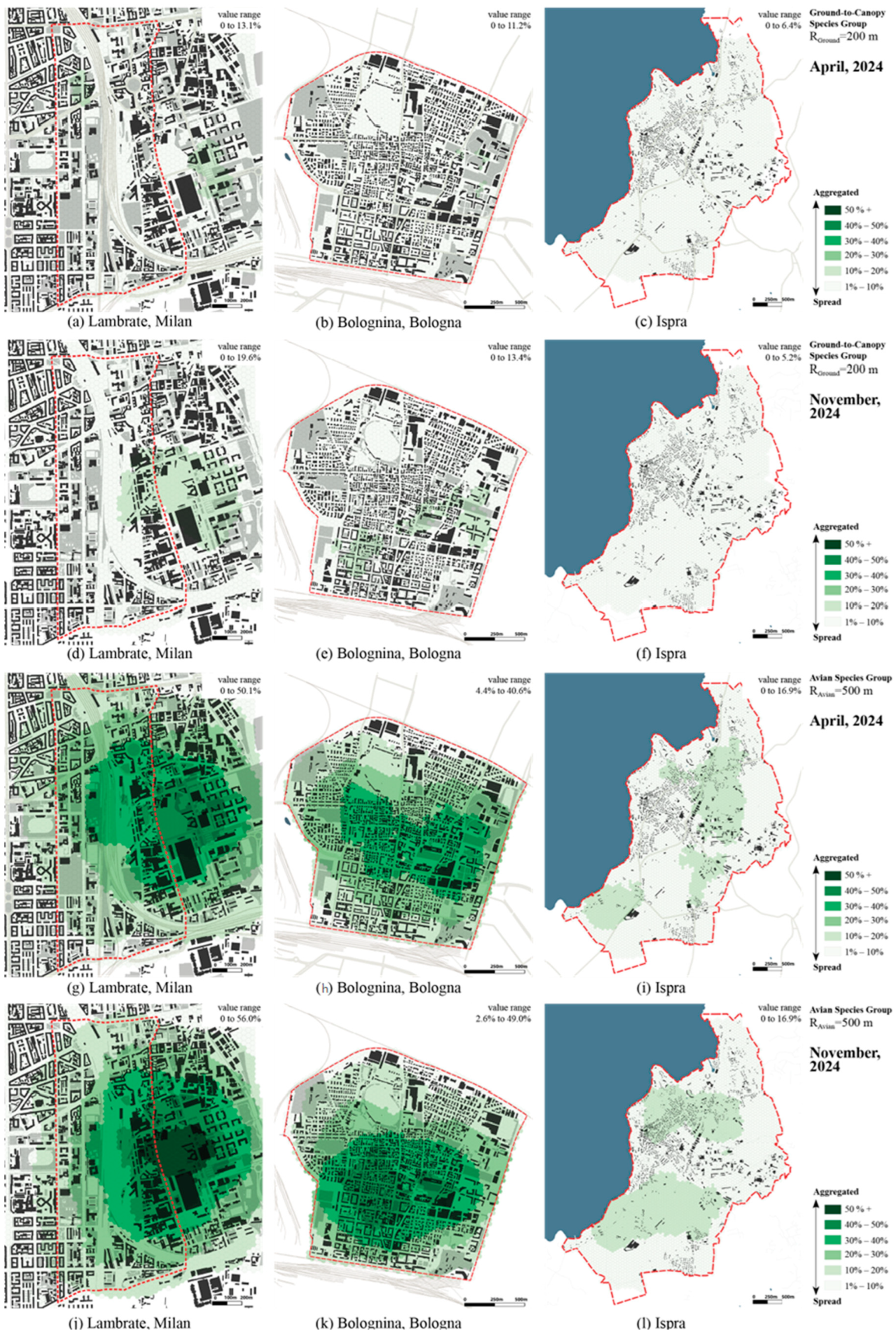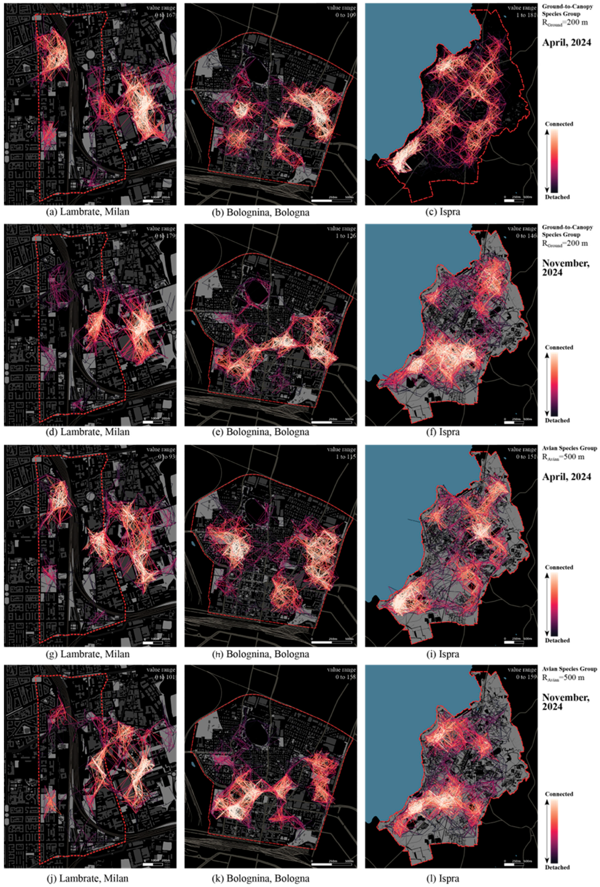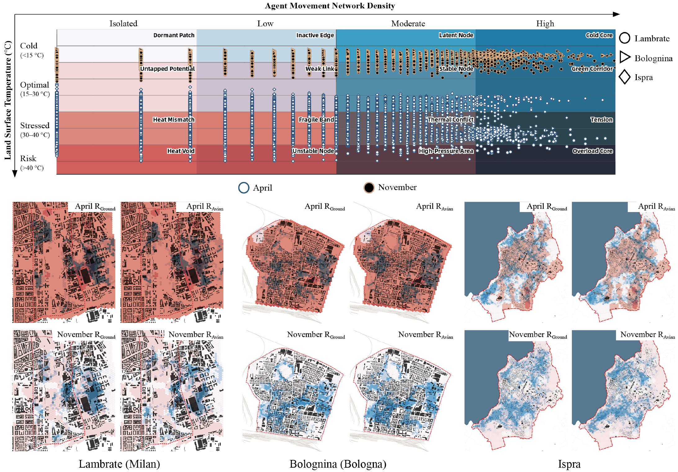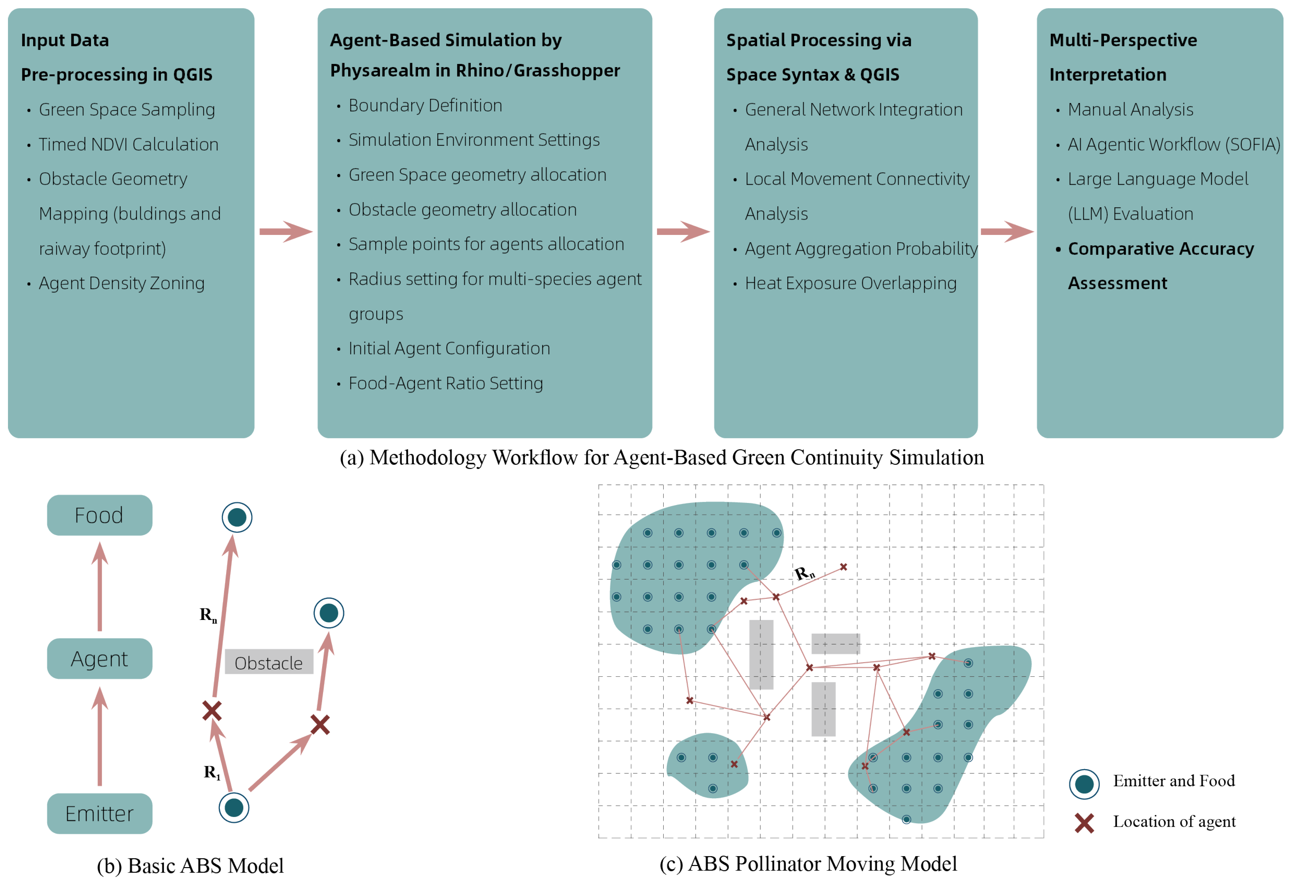 - This paper introduces a novel method to evaluate urban green infrastructure performance by combining multi-species agent simulation and space syntax analysis. Specifically, the results of the Agent-based simulation of ecological behaviors reveal hidden green networks that are not aligned with existing green space layouts. Moreover, the spatial overlaps between pollinator intensity and thermal vulnerability expose coupled ecological–climatic risks in urban areas.