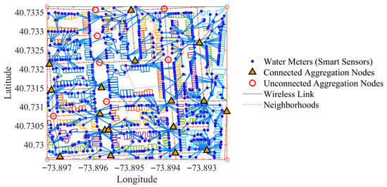 Figure 2 presents the georeferenced topology of the smart water monitoring system. It depicts the clustered locations of smart meters, the positioning of candidate aggregation nodes, and the base station, offering a comprehensive view of the urban deployment.