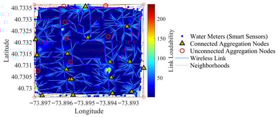 Figure 5 presents a comprehensive heatmap visualization of the link load intensity throughout the wireless sensor network (WSN) topology. This representation overlays the georeferenced urban scenario, including smart water meters (sensors), Data Aggregation Points (DAPs), and the base station. The heatmap is constructed from the cumulative usage frequency of each communication link, as determined by the routing paths from sensors to the Internet node located at the base station.