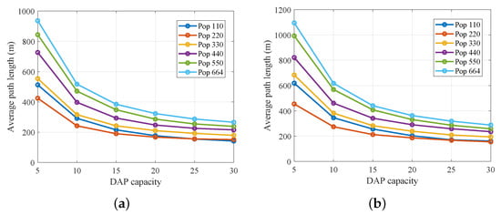 m), exhibits a consistent vertical offset of approximately 100–150 m across all capacity levels. This shift demonstrates that raising maximum-hop thresholds extends individual hop distances, preferring fewer but longer direct links and potentially overloading key edges. Together, these figures confirm both the scalability of our connectivity-oriented optimization framework—since average path length reliably decreases with higher DAP capacity—and its tunability, as the parameters
