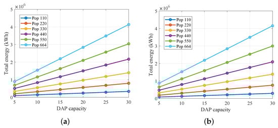 Figure 7 shows how total network energy consumption (kWh) scales with Data Aggregation Point (DAP) capacity for deployments of 110–664 nodes under two hop-distance parametrizations.