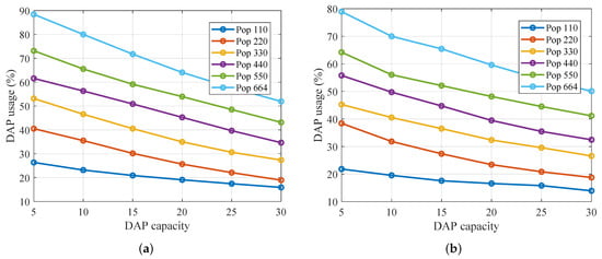 In subfigure (b), under the more permissive hop-distance regime ( m,  m,  m), the utilization curves exhibit a similar downward trend but start at slightly lower values—e.g., 22%→14% for 110 nodes and 79%→50% for 664 nodes—because longer allowable hops distribute traffic across more DAPs. These results confirm that our framework not only scales with capacity but can also be tuned via hop-distance parameters to adjust the DAP load distribution.