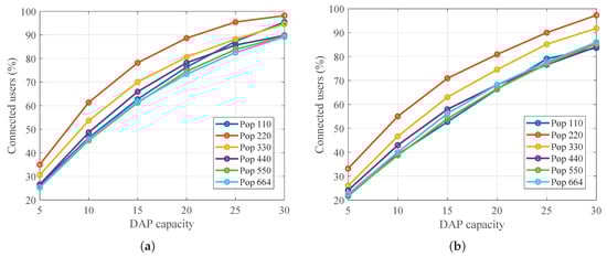 Figure 9 depicts the percentage of connected users as a function of DAP capacity for networks of 110–664 nodes under two hop-distance parametrizations.