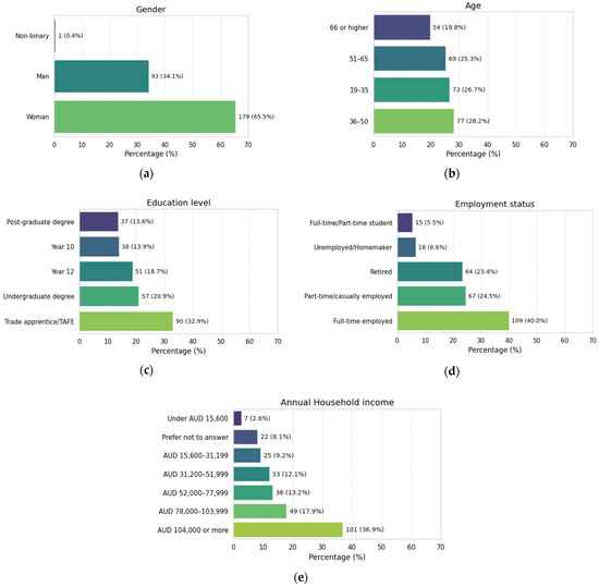 The socio-demographic profile of the survey participants (N = 273) revealed a predominantly female sample, with women comprising the majority (n = 179, 65.5%), followed by men (n = 93, 34.1%) and a negligible non-binary representation (n = 1, 0.4%). Age distribution was relatively even across younger and middle-aged groups, peaking at 36–50 years (n = 77, 28.2%) and lowest among those aged 66 years or older (n = 54, 19.8%). Education levels were highest for trade/apprenticeship or TAFE qualifications (n = 90, 32.9%), while Year 10 (n = 38, 13.9%) and postgraduate degrees (n = 37, 13.6%) were the least common. Employment status showed full-time employment as dominant (n = 109, 40.0%), with full-time or part-time students representing the smallest group (n = 15, 5.5%). Household income was skewed towards higher brackets, with AUD 104,000 or more the most prevalent (n = 101, 36.9%) and under AUD 15,600 the least (n = 7, 2.6%).