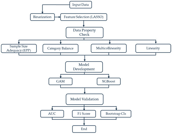 Internal consistency of the data was evaluated using Cronbach’s Alpha, with values ranging from 0.705 to 0.984, indicating acceptable to excellent reliability across constructs [37,38]. Figure 2 presents the data analysis process, including preprocessing via binarization and feature selection, followed by data property checks (sample size adequacy, category balance, multicollinearity, and linearity). Model development includes GAM to capture non-linear relationships interpretably, complemented by XGBoost for superior ensemble-based accuracy through model validations employing AUC, F1 score, and bootstrap CIs.