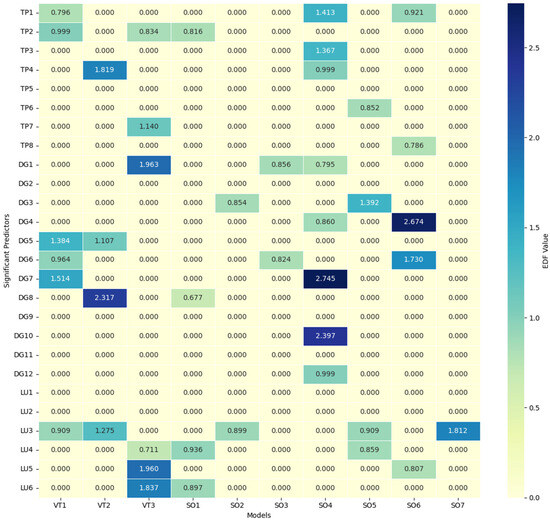 GAM significant predictor EDF values. (Note: VT1—small shuttle; VT2—minibus shuttle; VT3—standard-sized conventional bus; SO1—completely replace conventional buses; SO2—operate as a connector to existing fixed-route bus services; SO3—connector to longer distance services; SO4—operate as private taxi services; SO5—accommodate as a multipurpose service; SO6—integrated with other transport offerings; SO7—operate 24/7; TP1—work; TP2—school; TP3—university; TP4—shopping; TP5—medical; TP6—leisure; TP7—emergency; TP8—special events; DG1—school children; DG2—university students; DG3—working professionals; DG4—senior citizens; DG5—tourists; DG6—leisure travelers; DG7—people with physical disabilities; DG8—people with sensory disabilities; DG9—people with cognitive disabilities; DG10—low-income individuals; DG11—middle-income individuals; DG12—high-income individuals; LU1—residential neighborhoods; LU2—industrial/business parks; LU3—university precincts; LU4—agricultural land areas; LU5—tourist destinations; LU6—town centres).