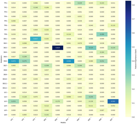 XGBoost predictors feature importance (Gain). (Note: VT1—small shuttle; VT2—minibus shuttle; VT3—standard-sized conventional bus; SO1—completely replace conventional buses; SO2—operate as a connector to existing fixed-route bus services; SO3—connector to longer distance services; SO4—operate as private taxi services; SO5—accommodate as a multipurpose service; SO6—integrated with other transport offerings; SO7—operate 24/7; TP1—work; TP2—school; TP3—university; TP4—shopping; TP5—medical; TP6—leisure; TP7—emergency; TP8—special events; DG1—school children; DG2—university students; DG3—working professionals; DG4—senior citizens; DG5—tourists; DG6—leisure travelers; DG7—people with physical disabilities, DG8—people with sensory disabilities; DG9—people with cognitive disabilities; DG10—low-income individuals; DG11—middle-income individuals; DG12—high-income individuals; LU1—residential neighborhoods; LU2—industrial/business parks, LU3—university precincts; LU4—agricultural land areas; LU5—tourist destinations; LU6—town centres).