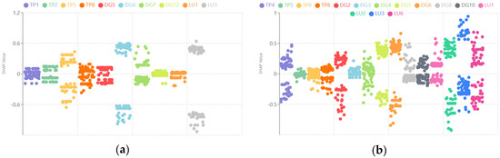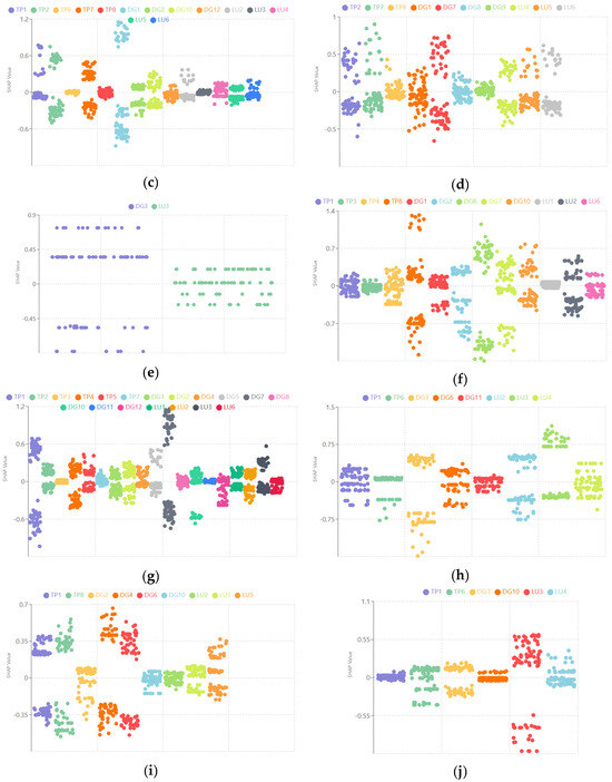 Combined swarm plots of SHAP values for XGBoost. (a) VT1. (b) VT2. (c) VT3. (d) SO1. (e) SO2. (f) SO3. (g) SO4. (h) SO5. (i) SO6. (j) SO7. (Note: VT1—small shuttle; VT2 —minibus shuttle; VT3—standard-sized conventional bus; SO1—completely replace conventional buses; SO2—operate as a connector to existing fixed-route bus services; SO3—connector to longer distance services; SO4—operate as private taxi services; SO5—accommodate as a multipurpose service; SO6—integrated with other transport offerings; SO7—operate 24/7; TP1—work; TP2—school; TP3—university; TP4—shopping; TP5—medical; TP6—leisure; TP7—emergency; TP8—special events; DG1—school children; DG2—university students; DG3—working professionals; DG4—senior citizens; DG5—tourists; DG6—leisure travelers; DG7—people with physical disabilities; DG8—people with sensory disabilities; DG9—people with cognitive disabilities; DG10—low-income individuals; DG11—middle-income individuals; DG12—high-income individuals; LU1—residential neighborhoods; LU2—industrial/business parks; LU3—university precincts; LU4—agricultural land areas; LU5—tourist destinations; LU6—town centres).
