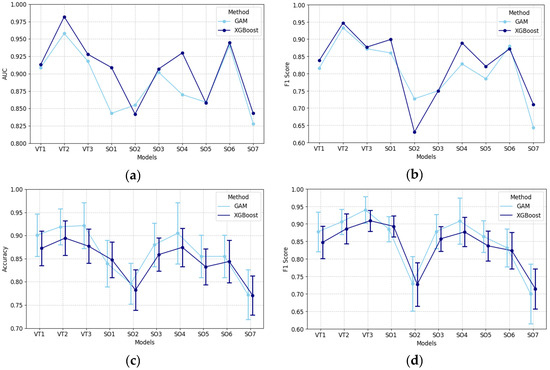 To quantify uncertainty in model performance, bootstrap resampling with iterations 95% Confidence Intervals (CIs) for accuracy and F1 scores. For a test set resamples are drawn with replacement, each of size . For each resample , the GAM and XGBoost model is refitted (or predictions are recomputed for XGBoost using the fitted model). This method assumes approximate normality of the bootstrap distribution for large , providing reliable intervals without parametric assumptions [67].
