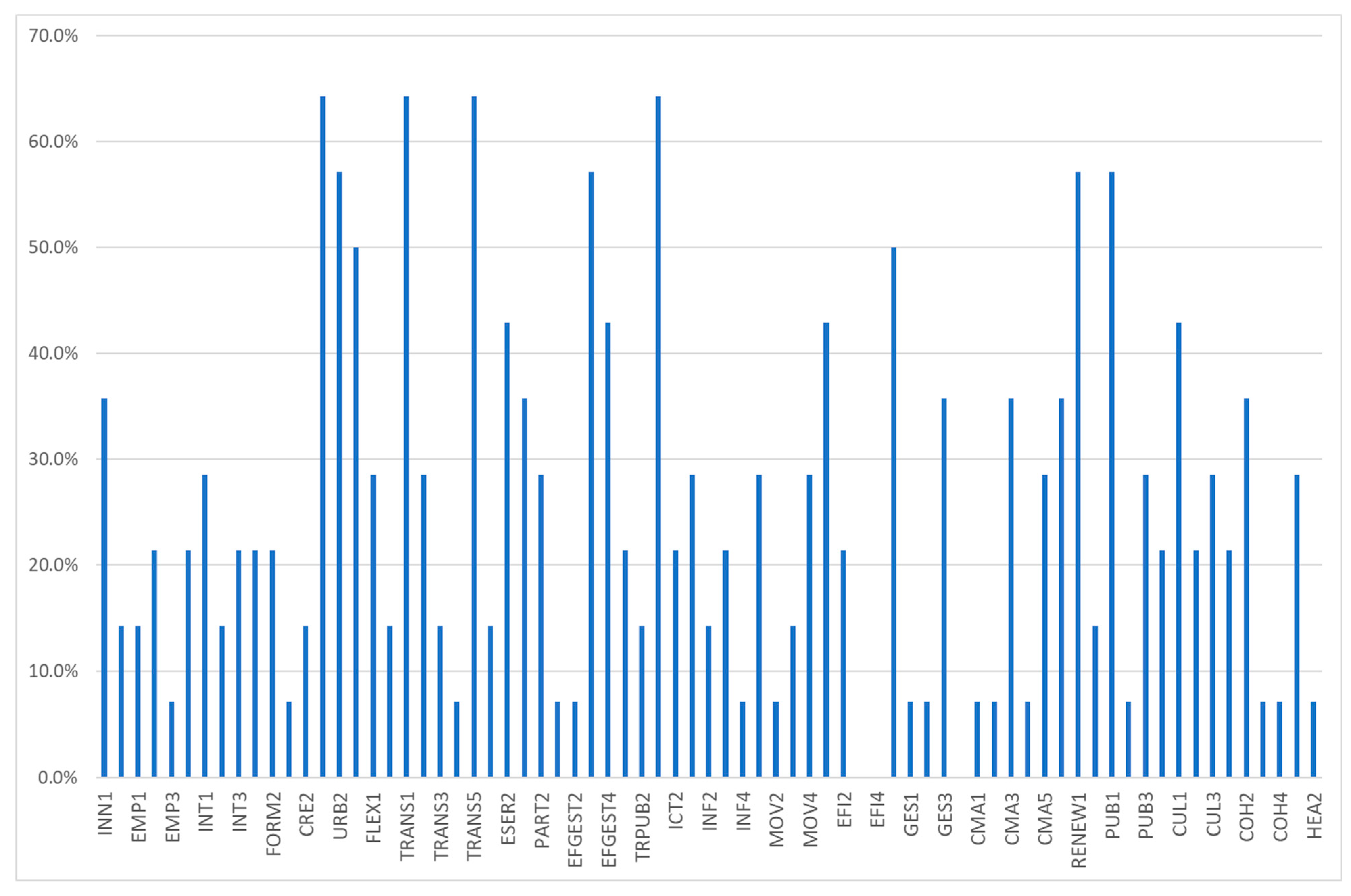 - Filter II: Relevance to project-level evaluation. Most indicator systems were designed to assess cities as a whole, and their indicators are not easily adaptable to project evaluation, which requires a more concrete and context-specific approach. This filter excluded indicators that were irrelevant, insufficiently precise, or unsuitable for application at the project scale. Indicators were discarded when they were too general in scope, required data available only at national or regional levels, measured magnitudes that cannot be directly influenced by project actions, or were vaguely defined in the source frameworks without a clear measurement procedure.
