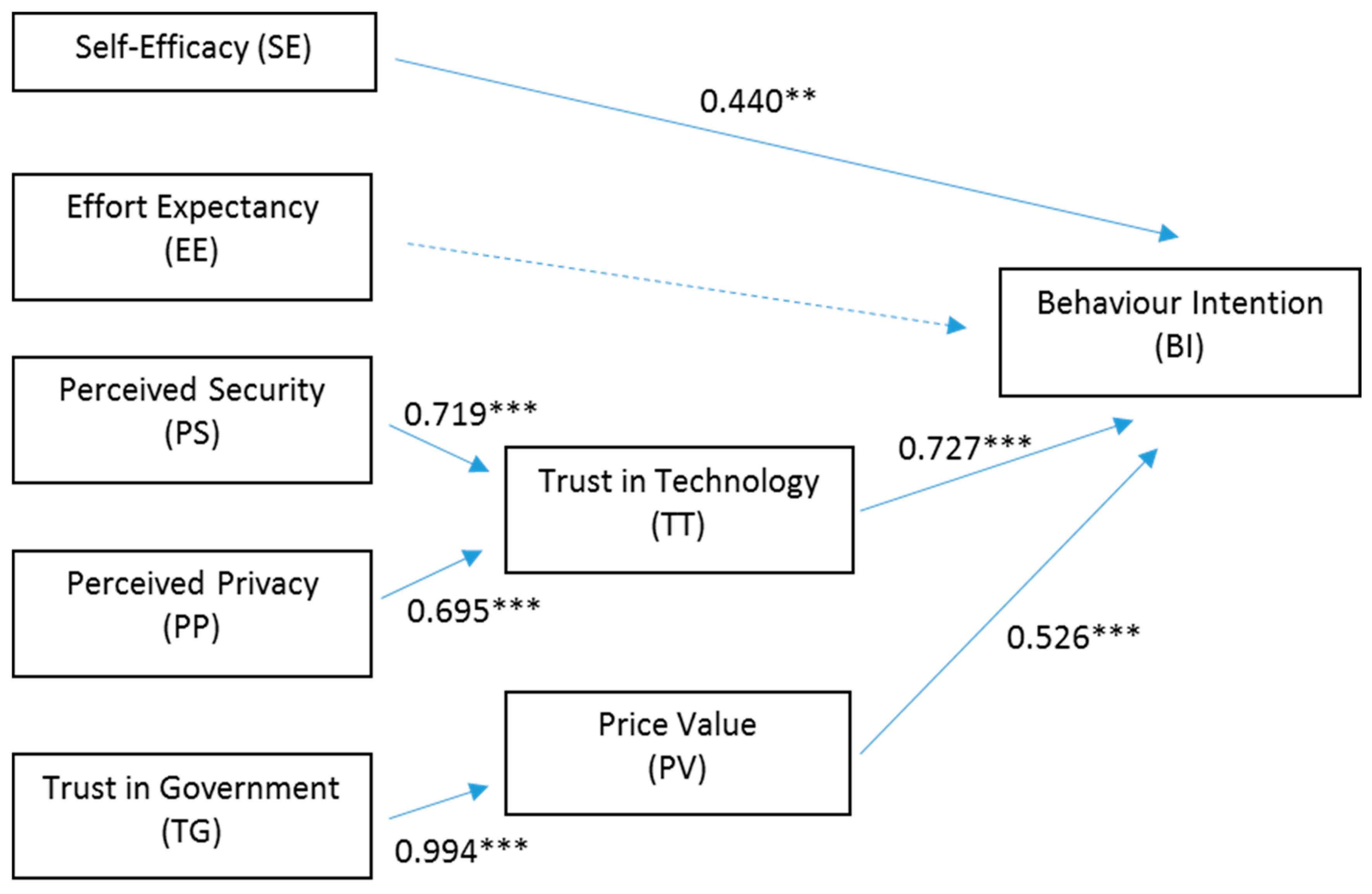 Perceived Security | → | Trust in Technology | 0.719 | <0.001 | 0.699 | 0.737 |
