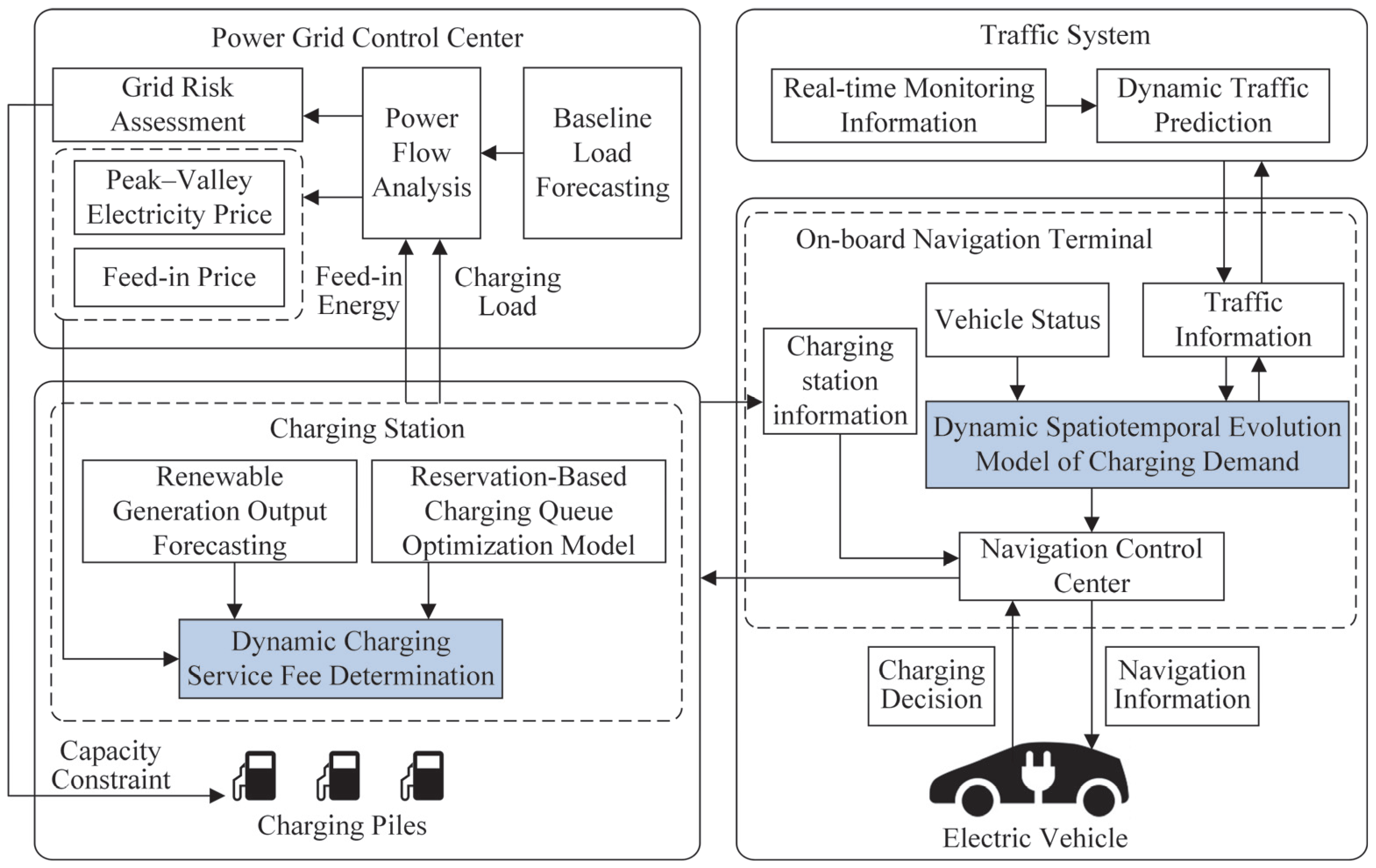 - Electric vehicles can be regarded as distributed loads and controllable power sources. The large-scale integration of electric vehicles will transform the traditional radial power grid into a complex network of distributed micro-storage and user interconnections with spatiotemporal stochastic characteristics. The interconnection between navigation systems and power dispatching systems enables power grid companies to monitor the status of electric vehicles in real time and to make accurate predictions of the spatiotemporal distribution of electric vehicle charging demand, thereby allowing dispatching instructions to be issued in advance to ensure the safe, economical, and stable operation of the power grid;
