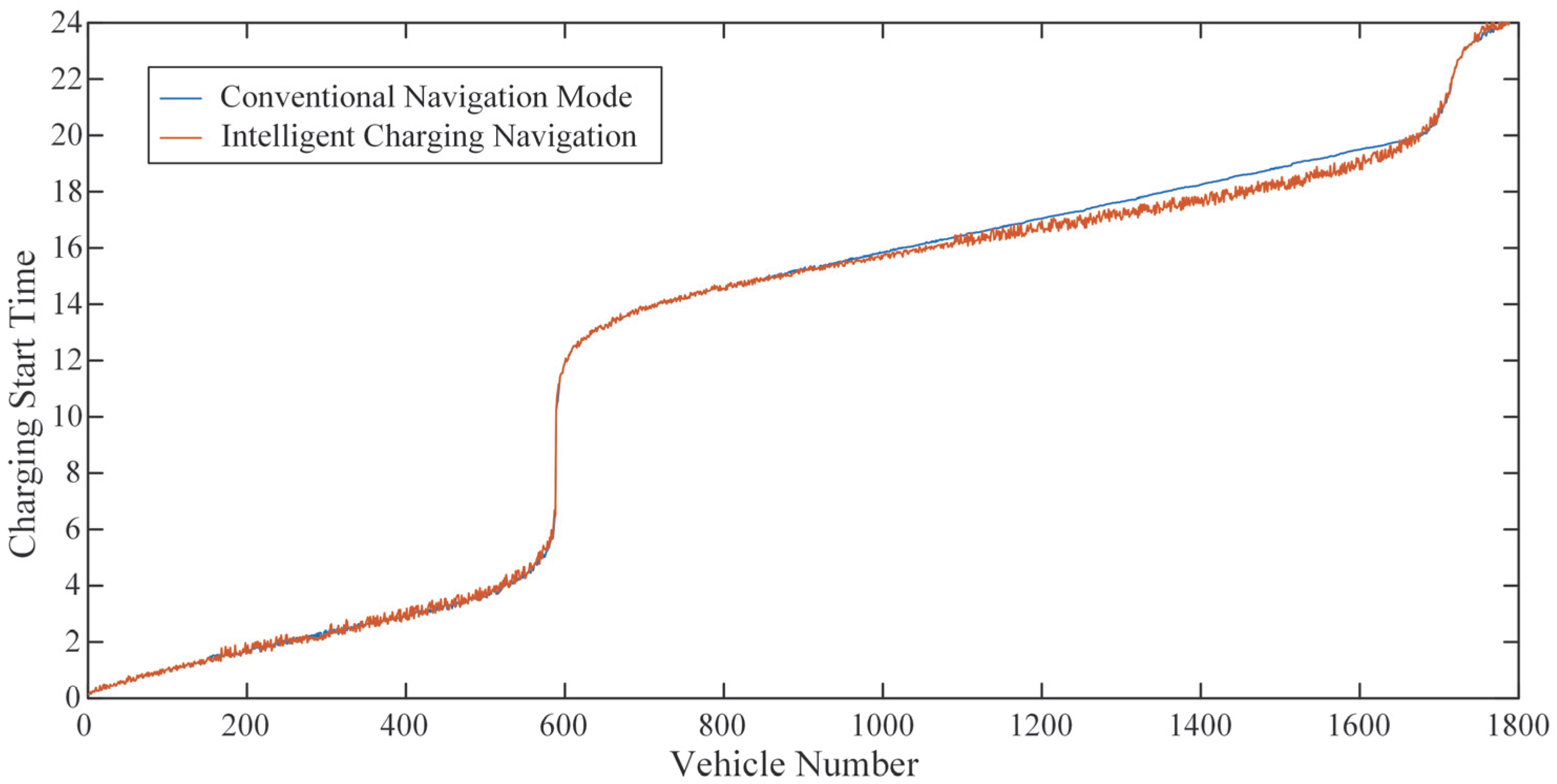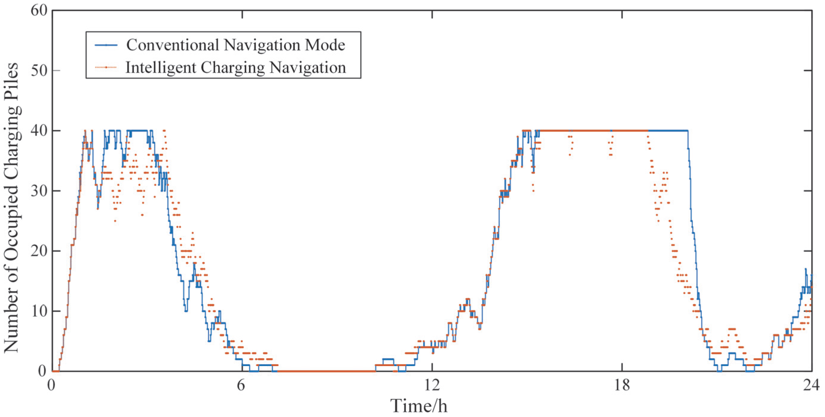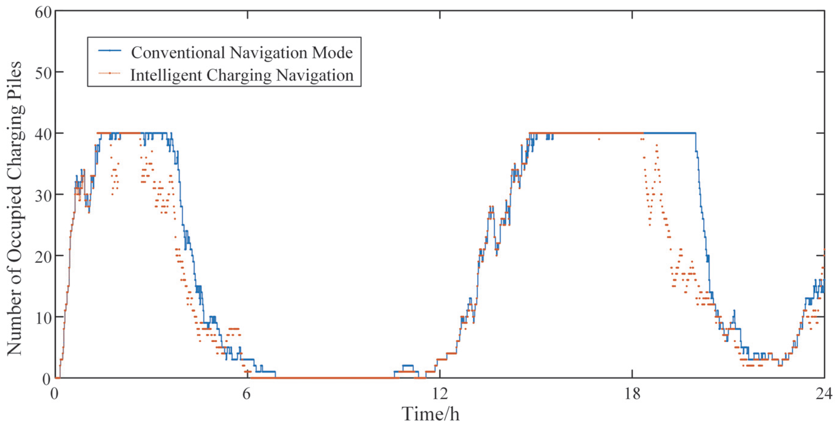- The control center processes new reservation requests based on the charging decision model and the dynamic dispatching model. In the intelligent charging navigation mode, charging piles can be in three states: idle, occupied, and insertable. In the conventional navigation mode, charging piles have only two states: idle and occupied, and user preferences and membership levels are not considered;