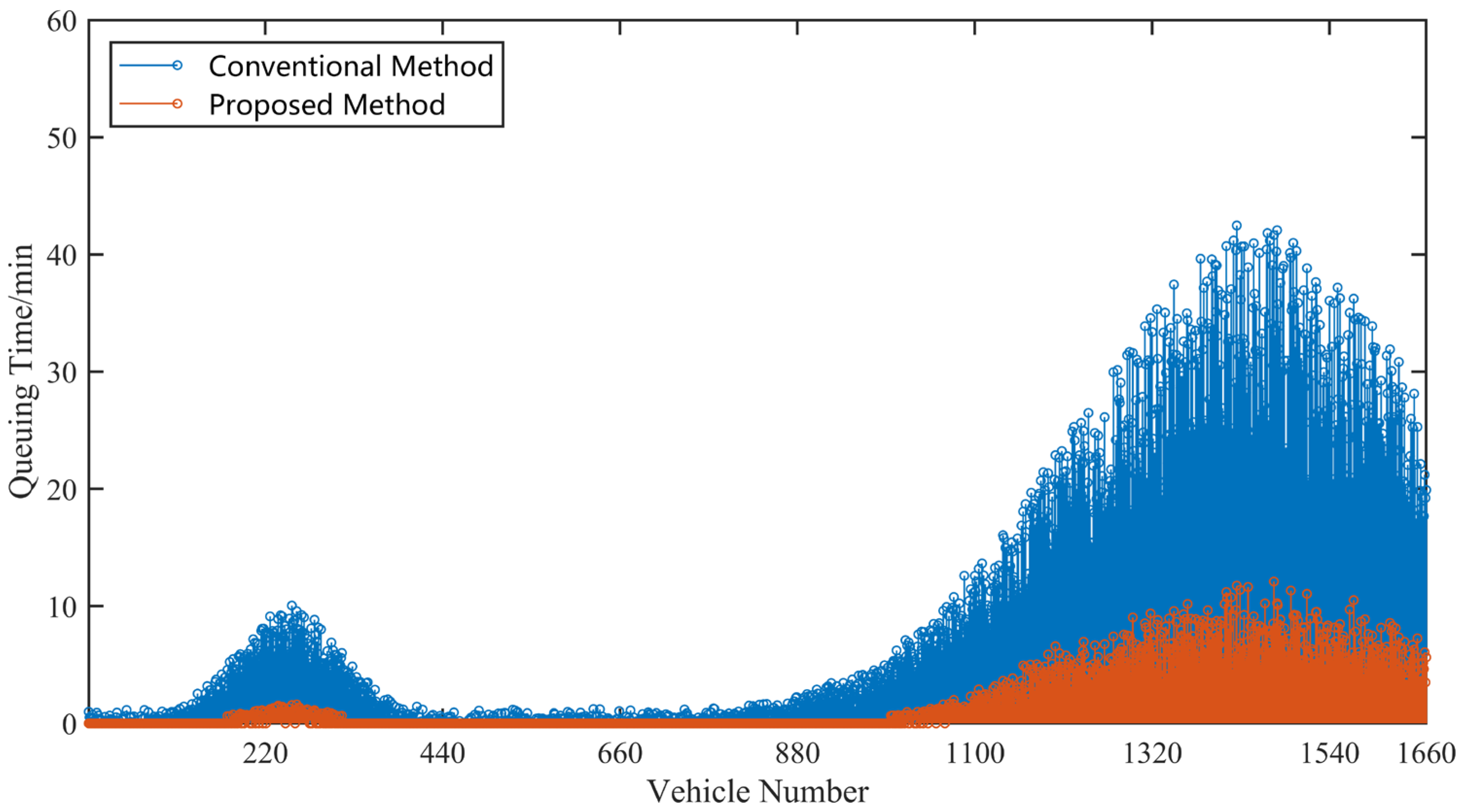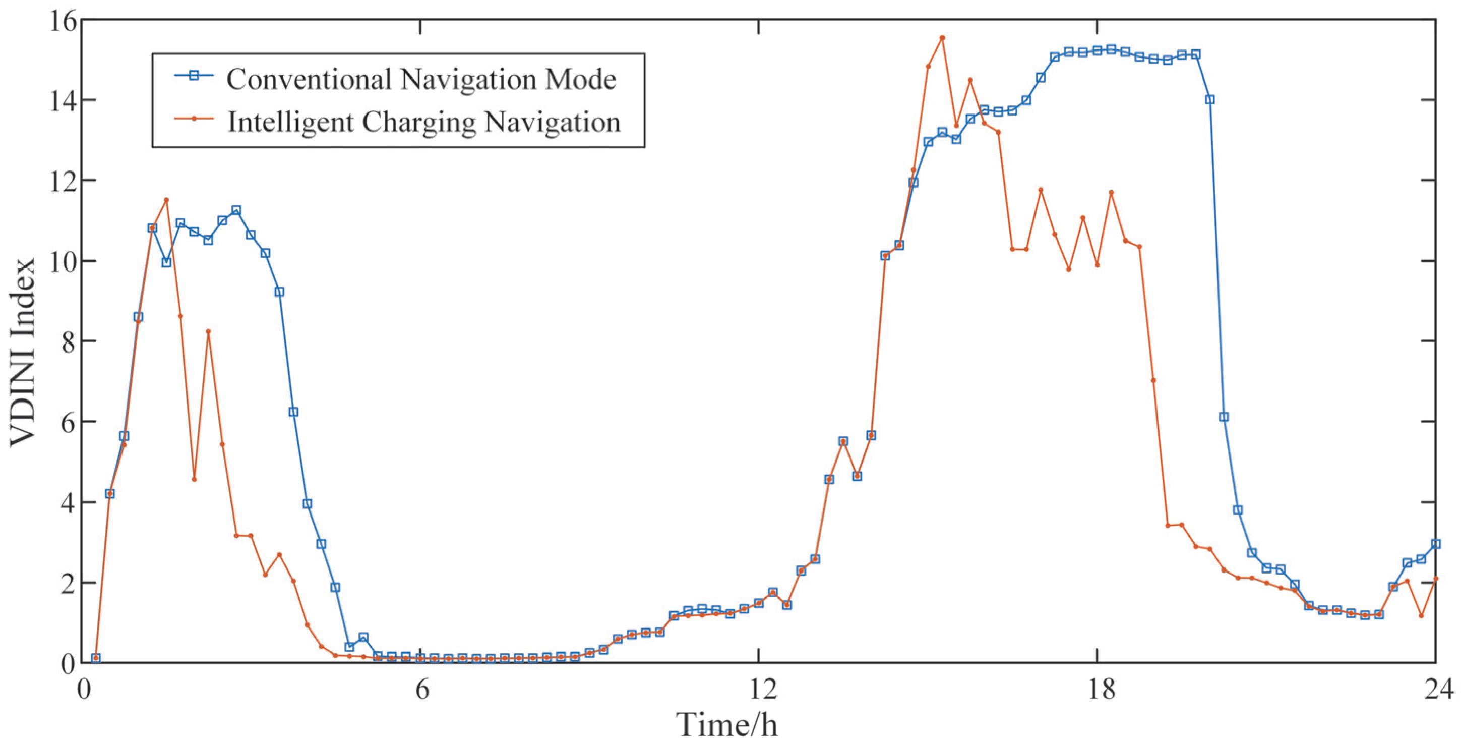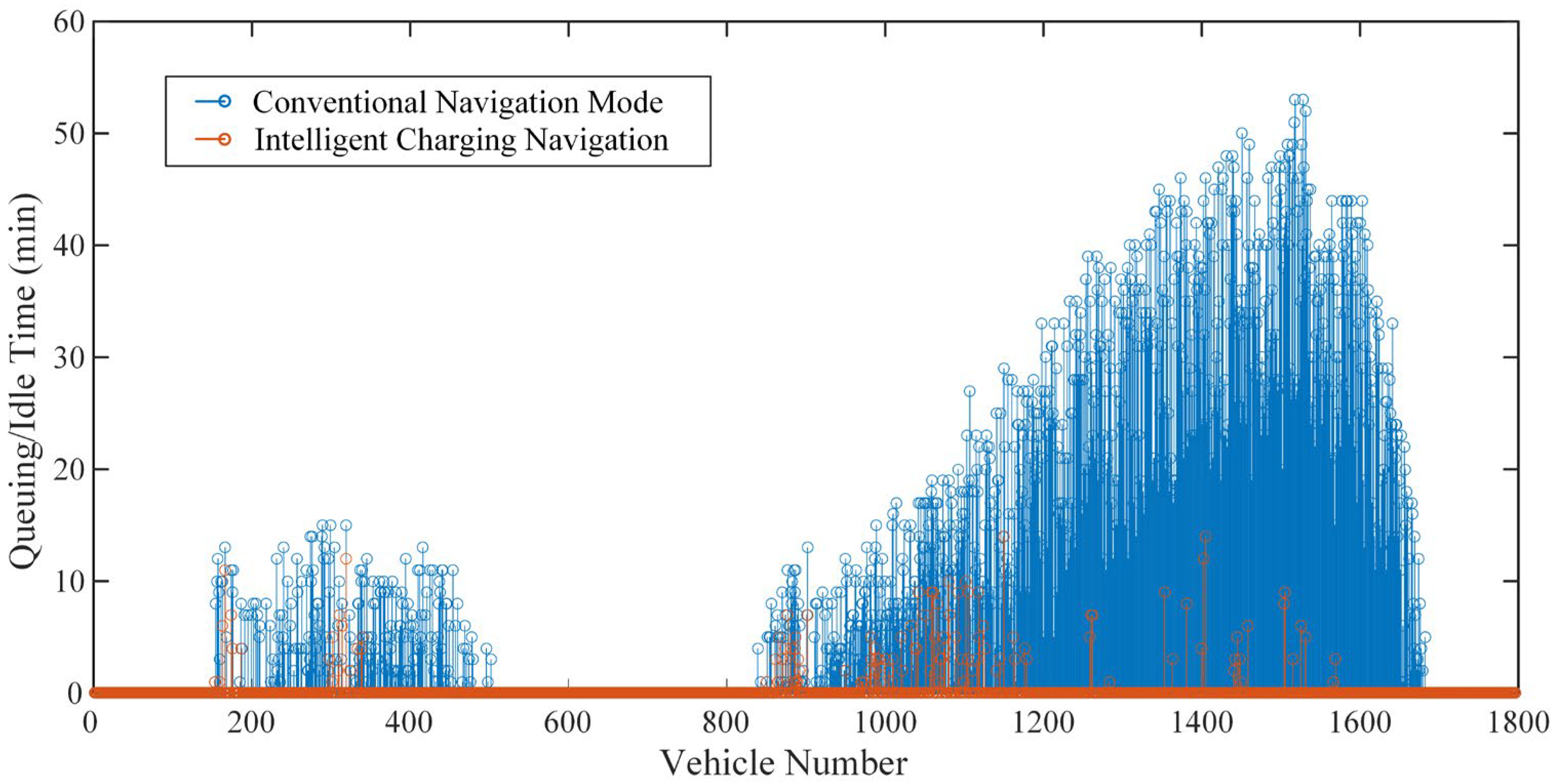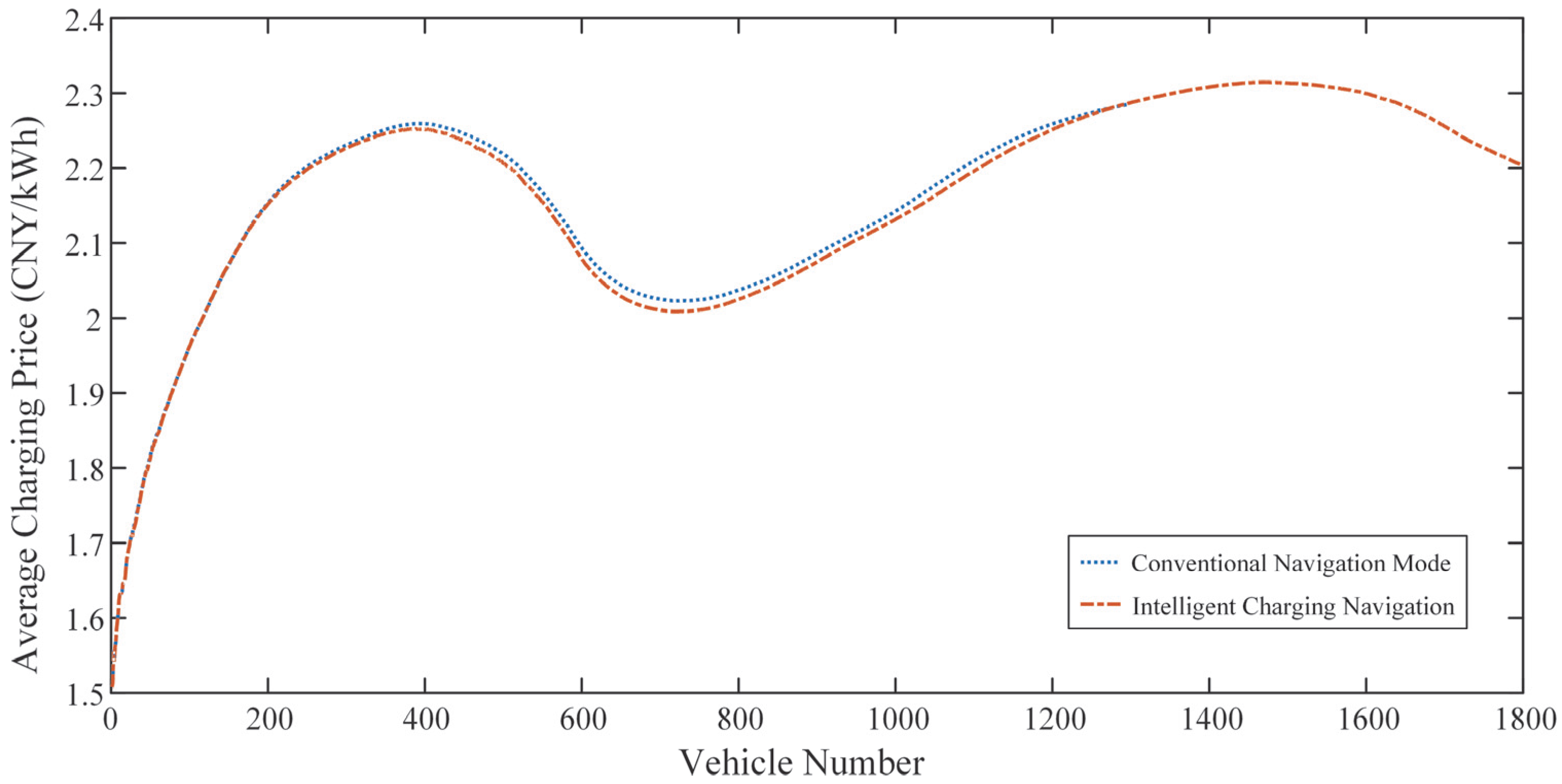 - The control center processes new reservation requests based on the charging decision model and the dynamic dispatching model. In the intelligent charging navigation mode, charging piles can be in three states: idle, occupied, and insertable. In the conventional navigation mode, charging piles have only two states: idle and occupied, and user preferences and membership levels are not considered;