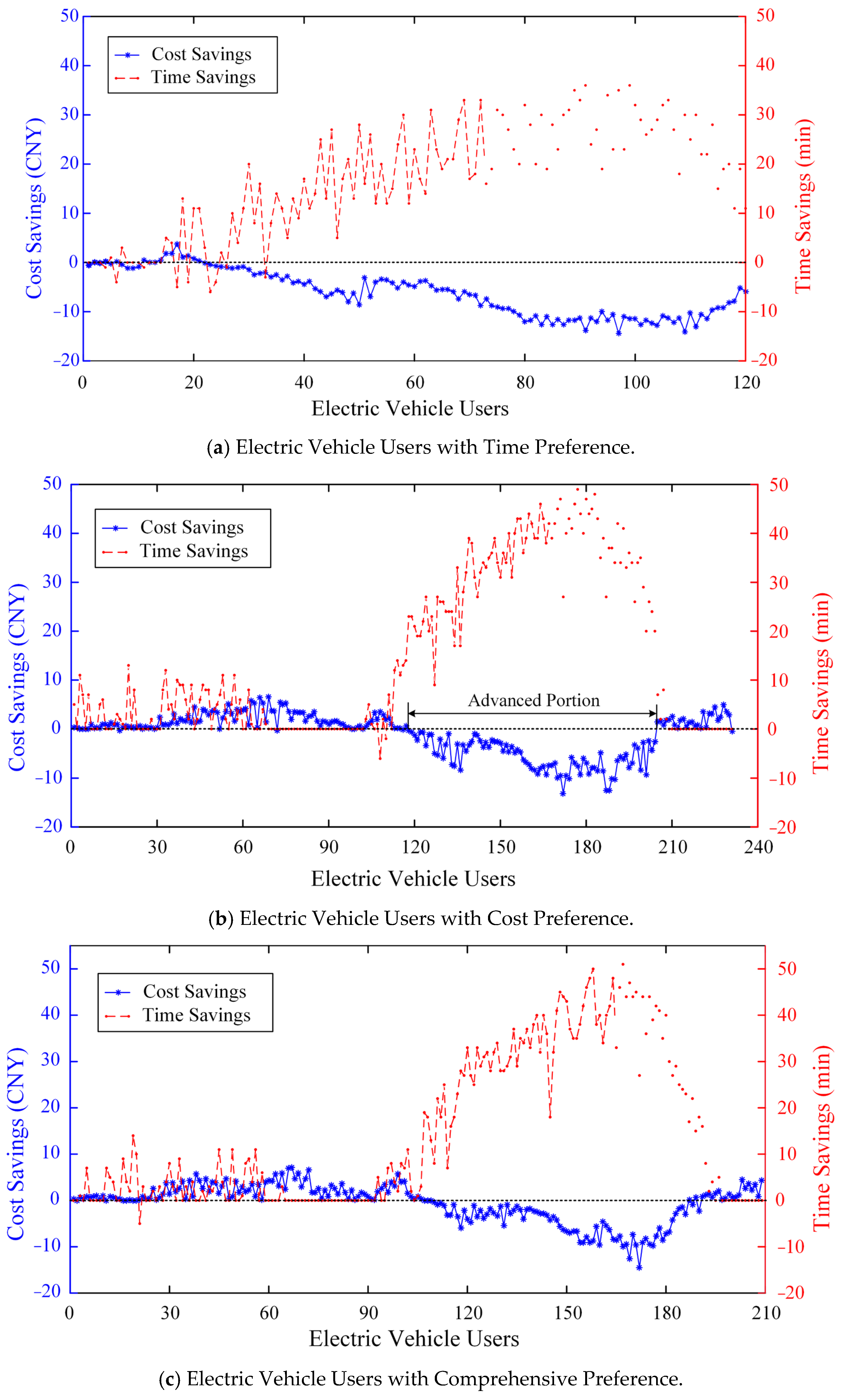 - When an electric vehicle generates a charging demand, it submits a reservation request to the control center containing charging behavior preferences and membership level. For ease of analysis, the proportions of the three types of preferences among all users are fixed at 1:1:1, the maximum membership level is six, and the preference type and membership level of each user are randomly generated;