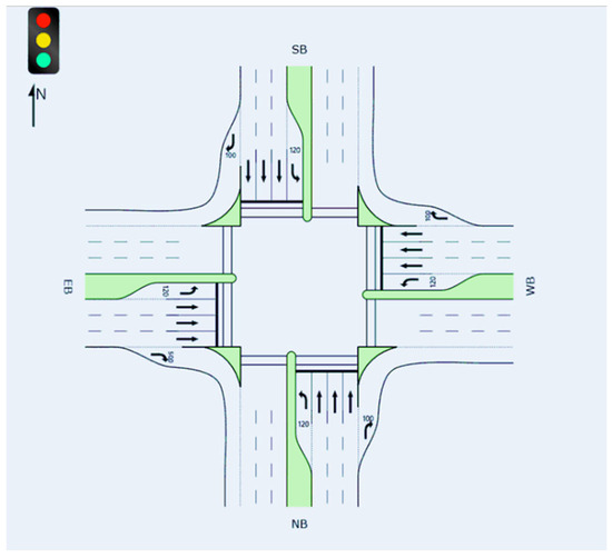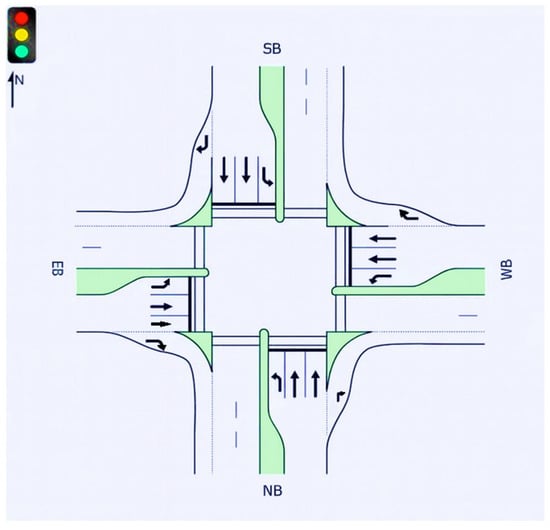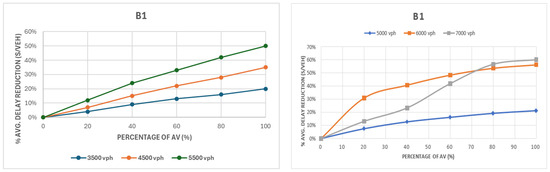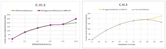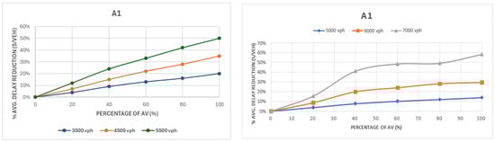Autonomous vehicles (AVs) hold strong potential to redefine traffic operations, yet their impacts at varying penetration levels within mixed traffic remain insufficiently quantified. This study evaluates the influence of SAE Level 5 AVs on traffic performance at two typical urban signalized intersections using a hybrid microsimulation approach that integrates behavioral AV modeling and performance evaluation. The analysis covers two typical intersection layouts, one with two through lanes and another with three, tested under varying traffic volumes and left-turn shares. A total of 324 simulation scenarios were conducted with AV penetration ranging from 0% to 100% (in 20% increments) and left-turn proportions of 15%, 30%, and 45%. The results show that 100% AV penetration lowers the average delay by up to 40% in the two-lane intersection scenario and 32% in the three-lane scenario, relative to the 0% AV baseline. Even 20% AV penetration yields about half of the maximum improvement. The greatest benefits occur with aggressive AV driving profiles, balanced approach volumes, and small left-turn shares. These findings provide preliminary evidence of AVs’ potential to enhance intersection efficiency and support Sustainable Development Goals (SDGs) 11 and 13, offering insights to guide intersection design and AV deployment strategies for data-driven, sustainable urban mobility. Full article