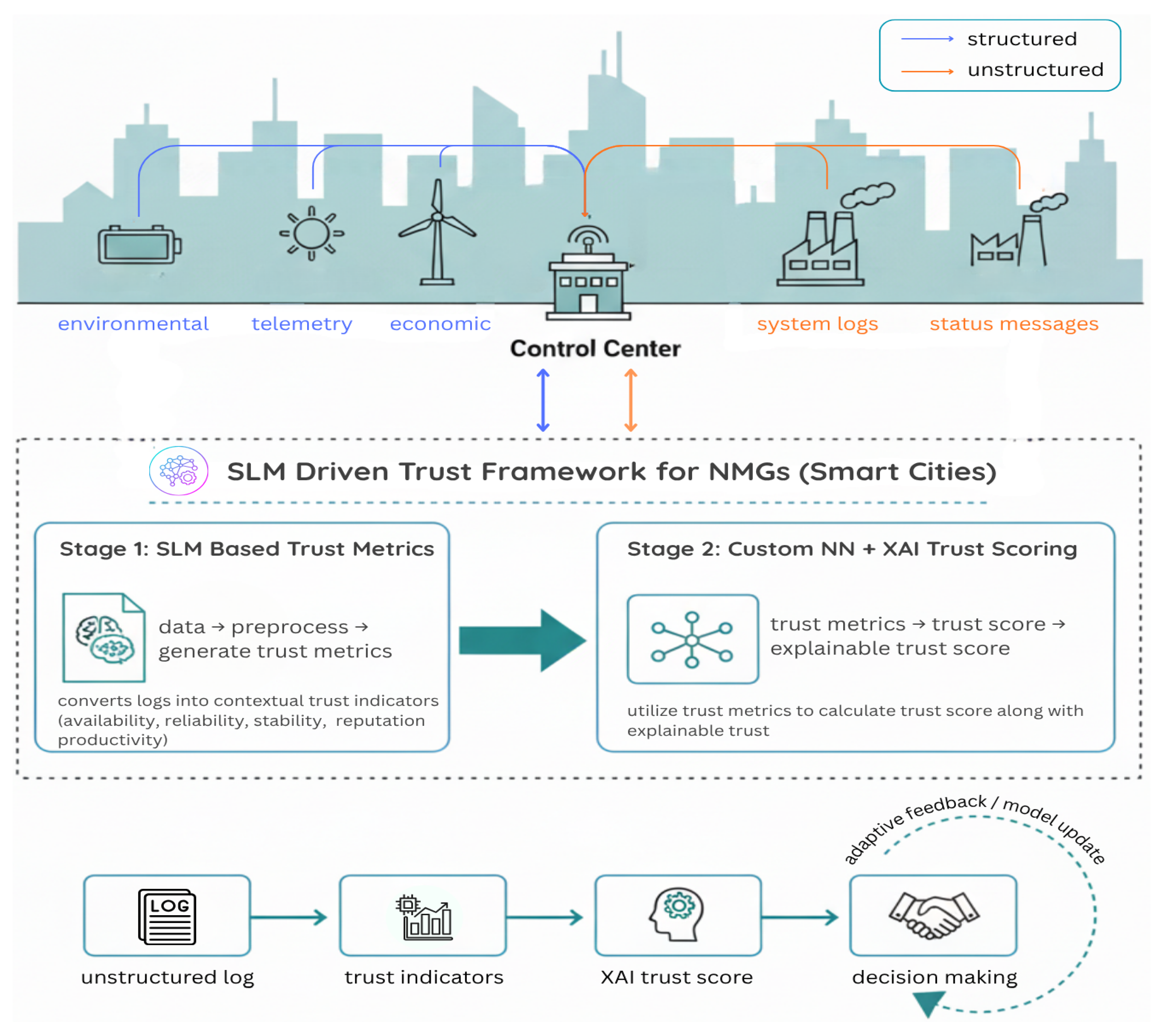 https://urbandevelopmentcph.kk.dk, accessed on 23 October 2025). In such systems, the trustworthiness of each DER is critical to ensure stable operation, as a single faulty or malicious unit (e.g., a compromised solar inverter) can disrupt power supply or compromise grid security. Even in centralized grid configurations, where a state utility may control power input, assessing individual DER trustworthiness ensures reliable contributions, facilitating efficient energy management and fault prevention across the NMG. This motivates the need for a trust evaluation framework capable of processing unstructured DER data, such as SCADA logs, to derive actionable trust metrics for smart city applications.