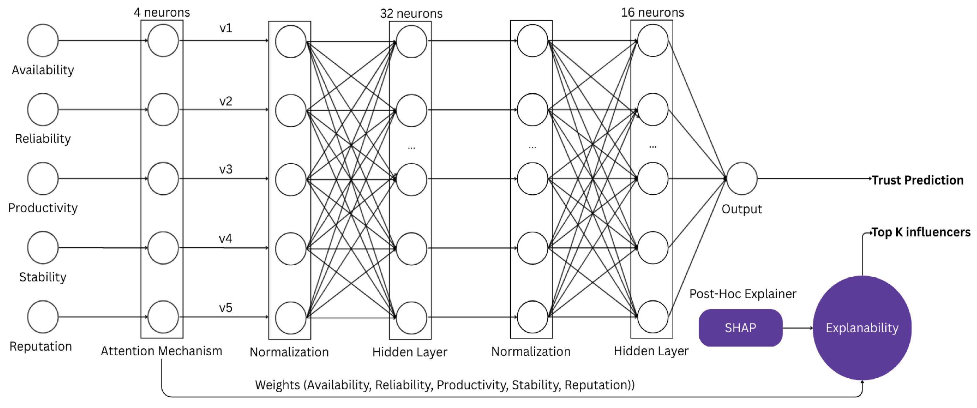 Develop a neural network-based trust framework that uses extracted indicators to compute precise and adaptive trust scores.