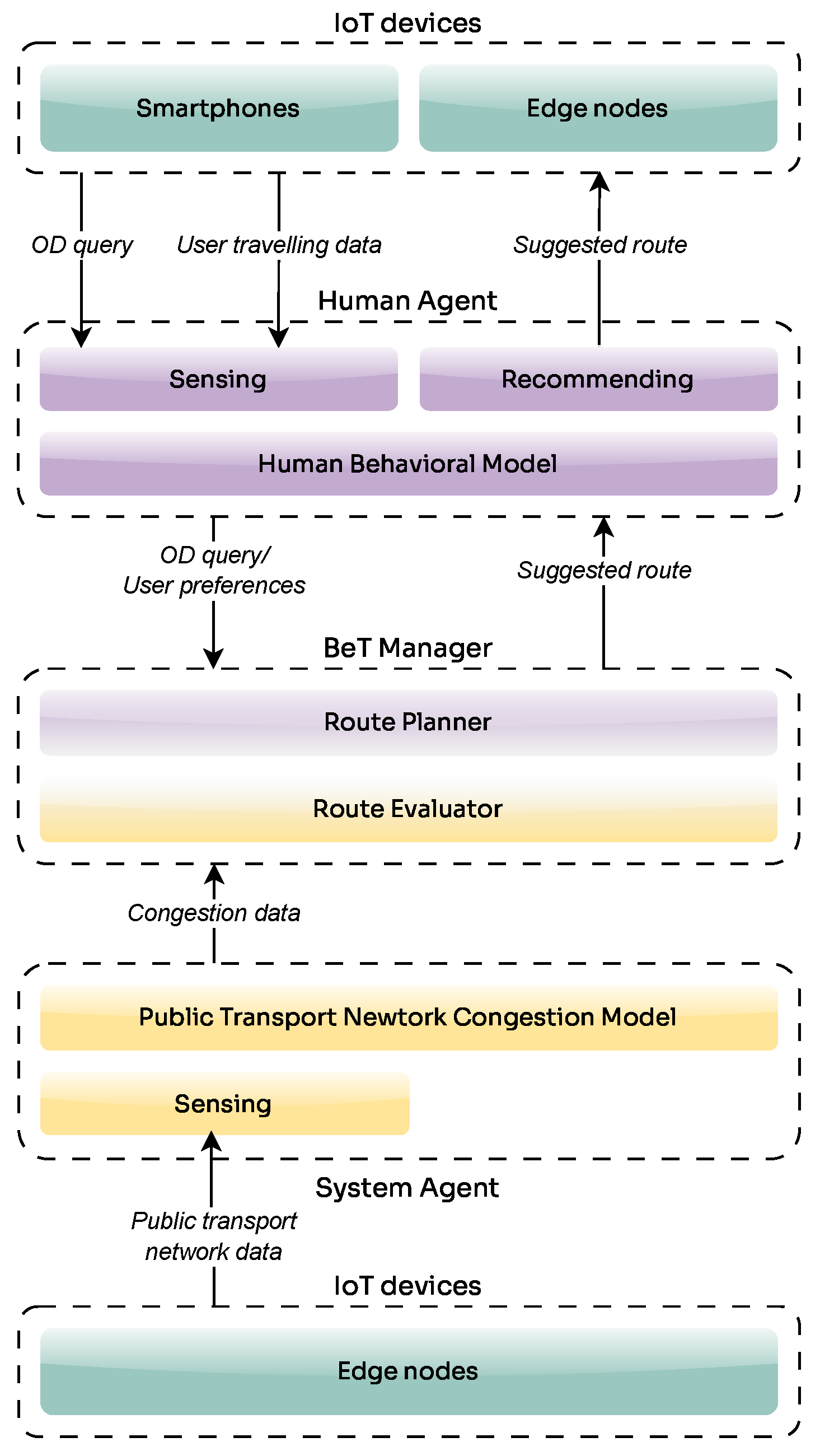 The results of our experiments show that the balanced strategy achieves a more efficient distribution of demand while preserving user satisfaction. From an urban transport planning perspective, this translates into concrete support for operators. By redistributing demand across alternative routes and exploiting the multimodal nature of the transport system, the approach enables a better load balance across the network, reducing the risk of overload on critical lines. This, in turn, can directly inform scheduling adjustments and fleet allocation. In addition, the ability to generate congestion-aware recommendations highlights where additional capacity may be required, such as increasing service frequency or deploying larger vehicles, thus providing actionable insights for more resilient and adaptive public transport management. Importantly, by incorporating the BeT paradigm and related architecture, the system not only generates indicators for planners but also provides a structured way to automatically support decision making, balancing QoE and QoS in public transportation systems.
