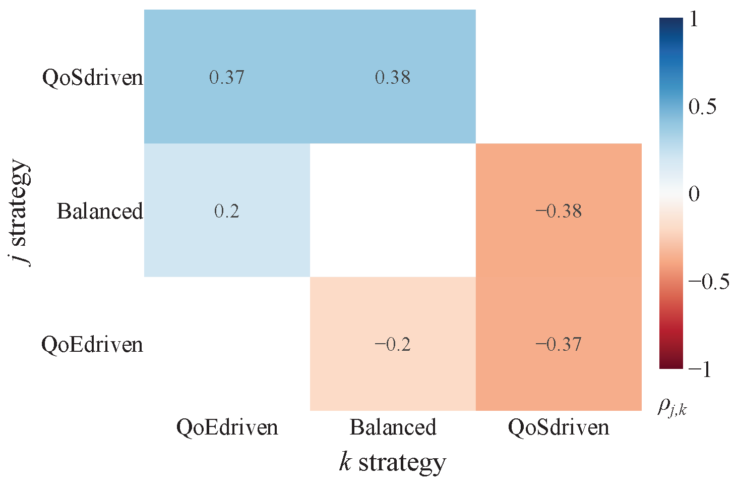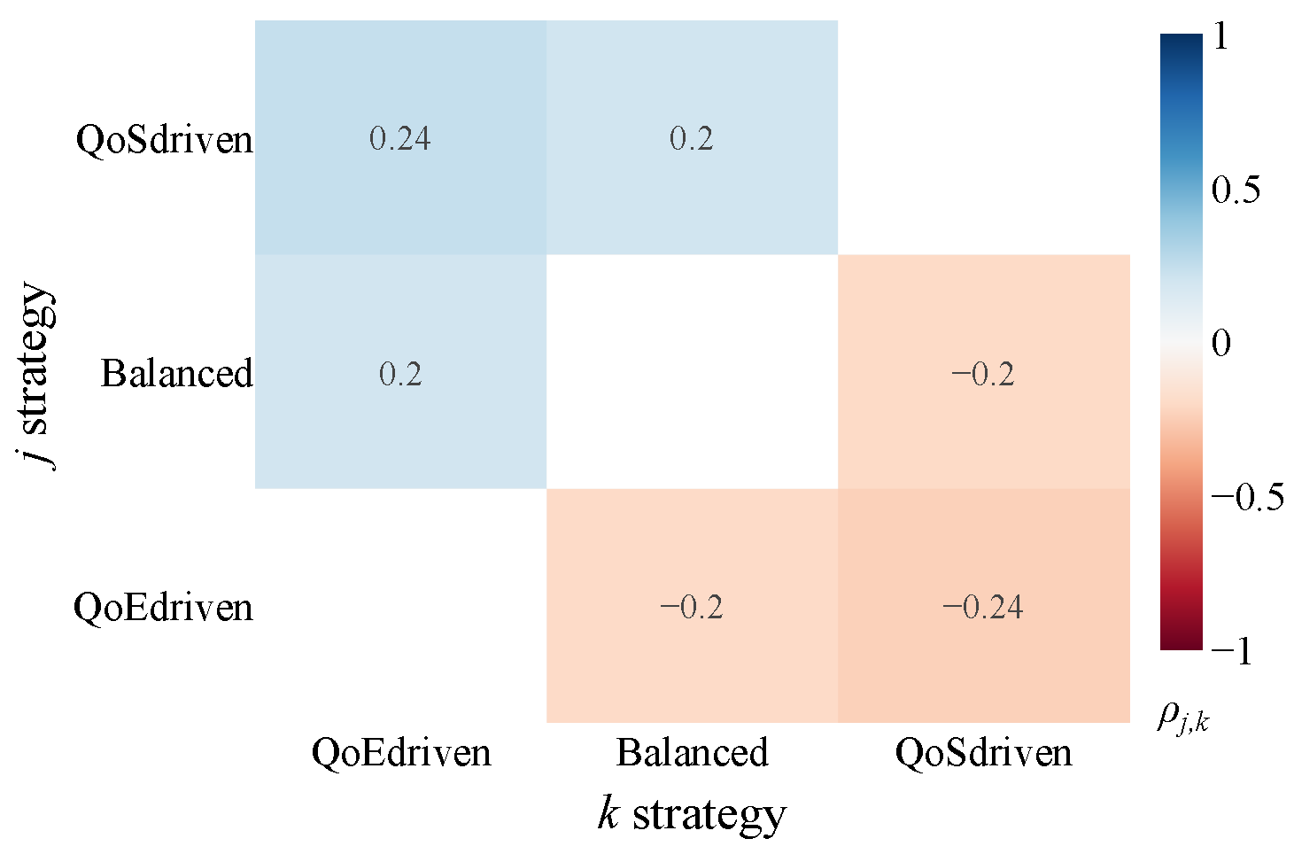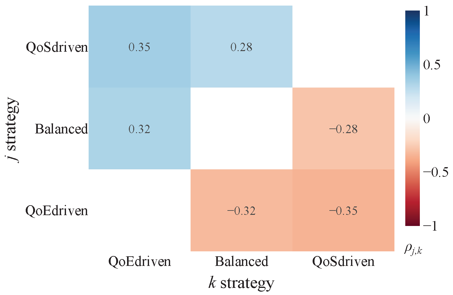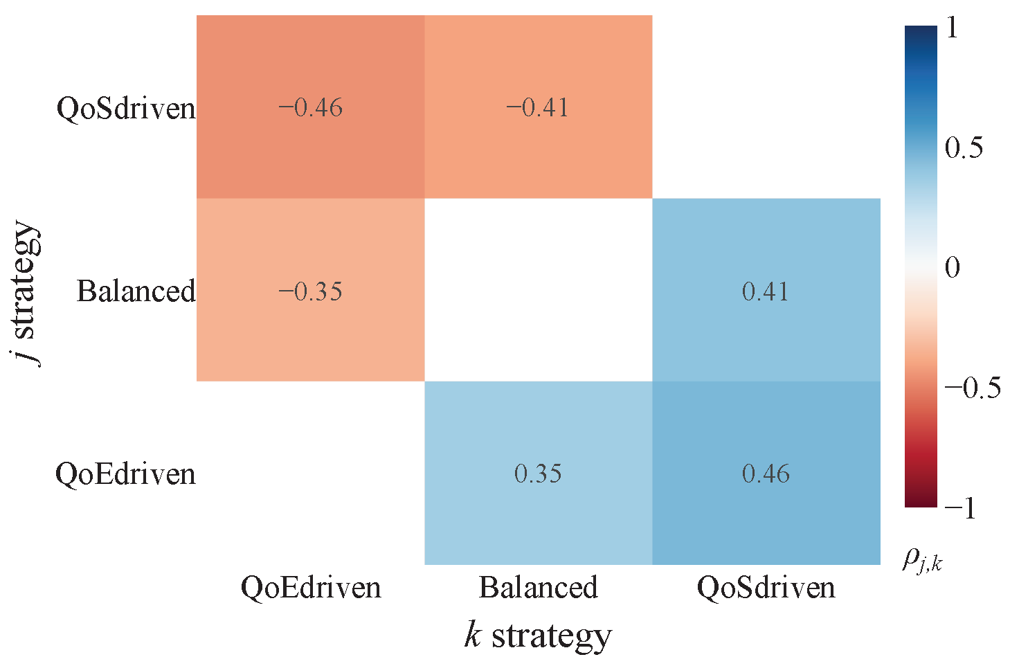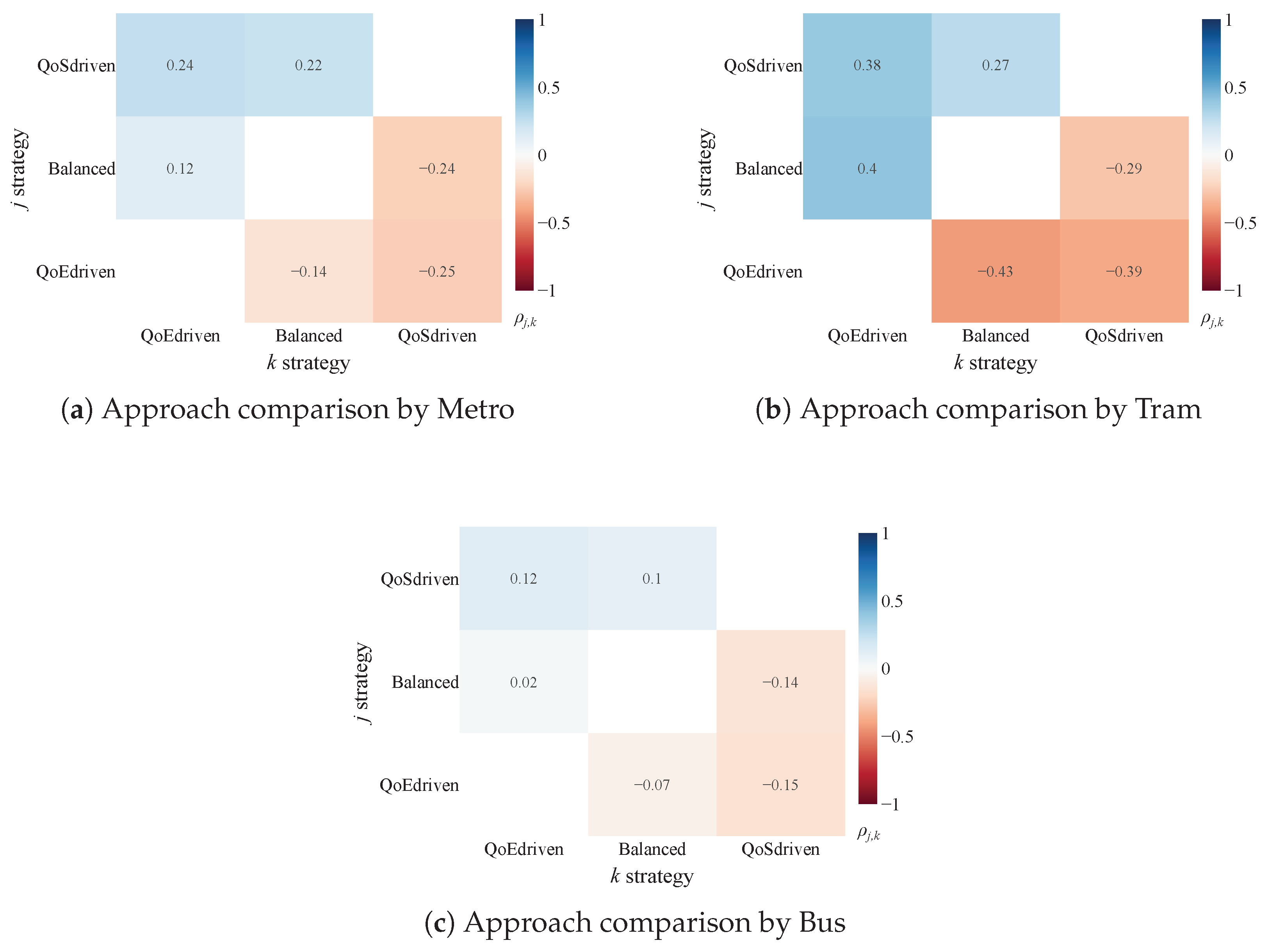 These scores are subsequently visualized using heatmaps for intuitive interpretation. The color gradient within these heatmaps directly indicates the comparative performance: bluer regions (tending towards +1) signify that approach j significantly and substantially reduces crowding compared to approach k, while redder regions (tending towards −1) indicate that approach j significantly increases it. The intensity of the color further reflects improvements or worsenings. Thus, the sign of immediately clarifies which approach yields a more favorable (lower CI) outcome.