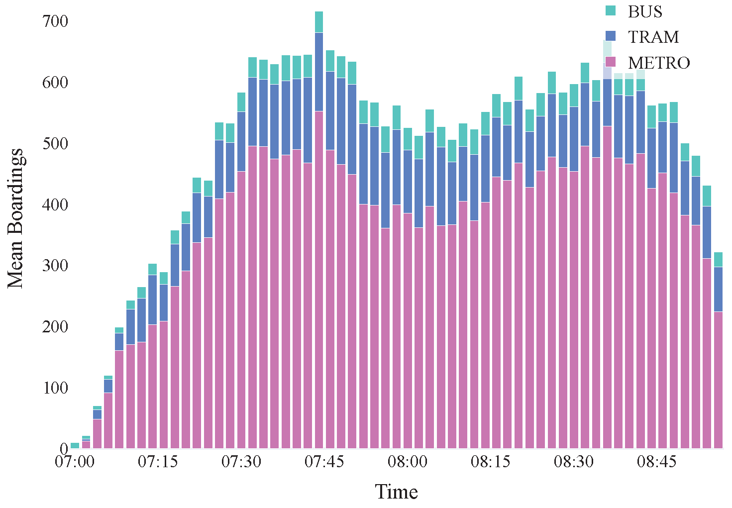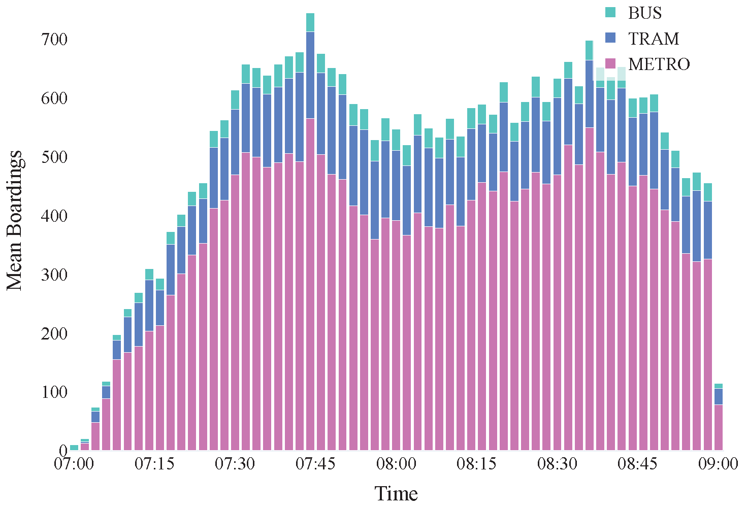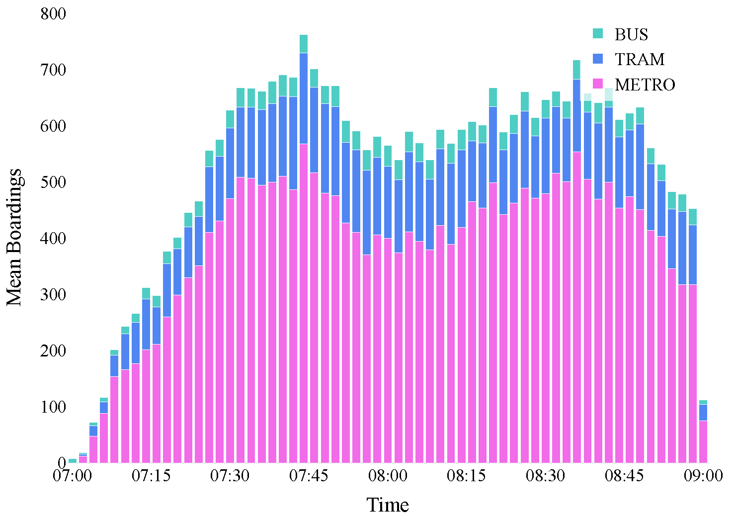 , we first counted the boardings within each 2-min time bin. Then, we divided that sum by the number of available vehicles for that class at that specific moment.