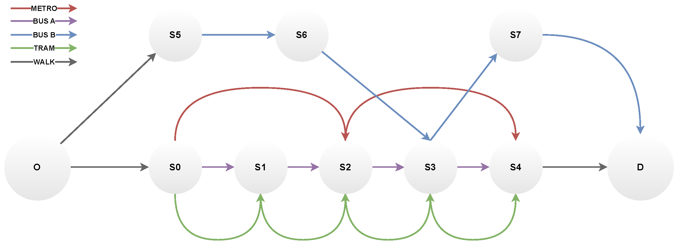 Figure 17. This network has two bus lines (A and B), one tram line, and one metro line. Buses and trams run less frequently than the metro, and have lower capacity (see