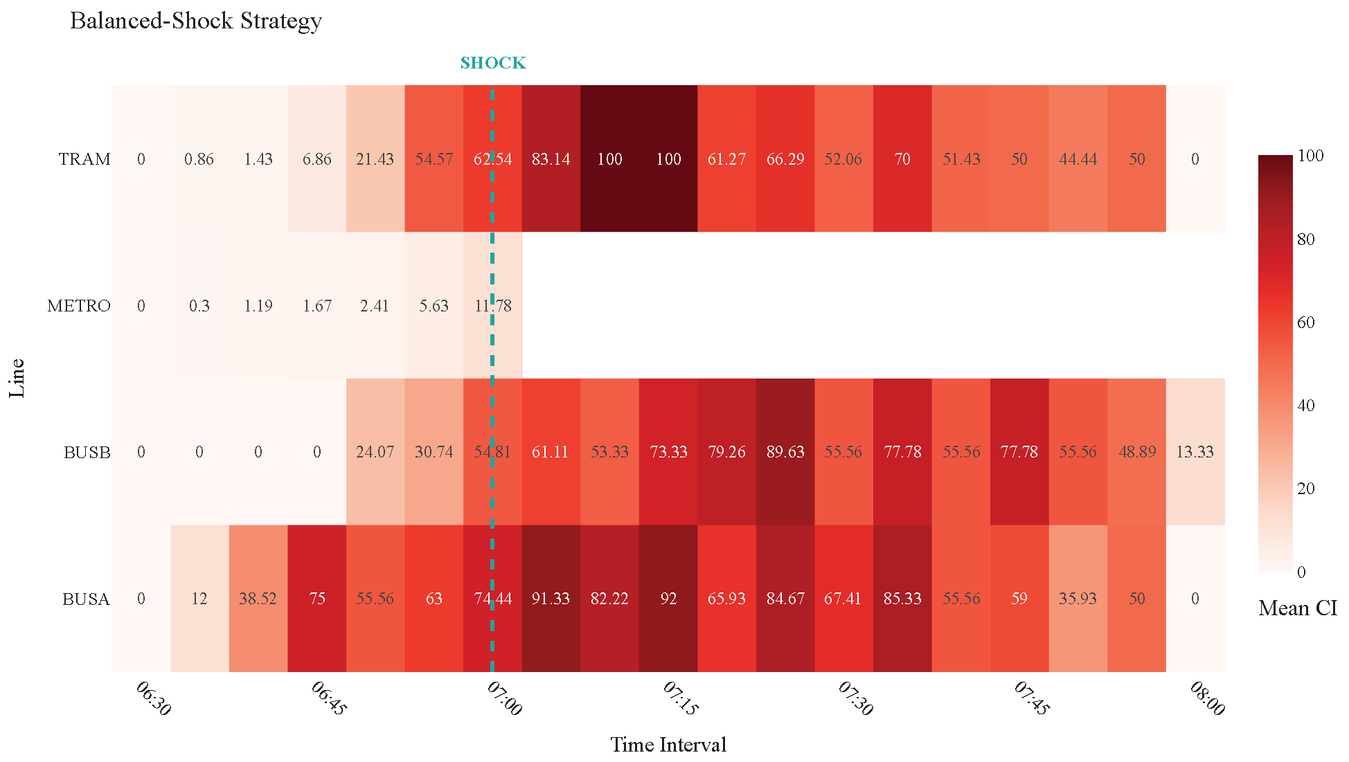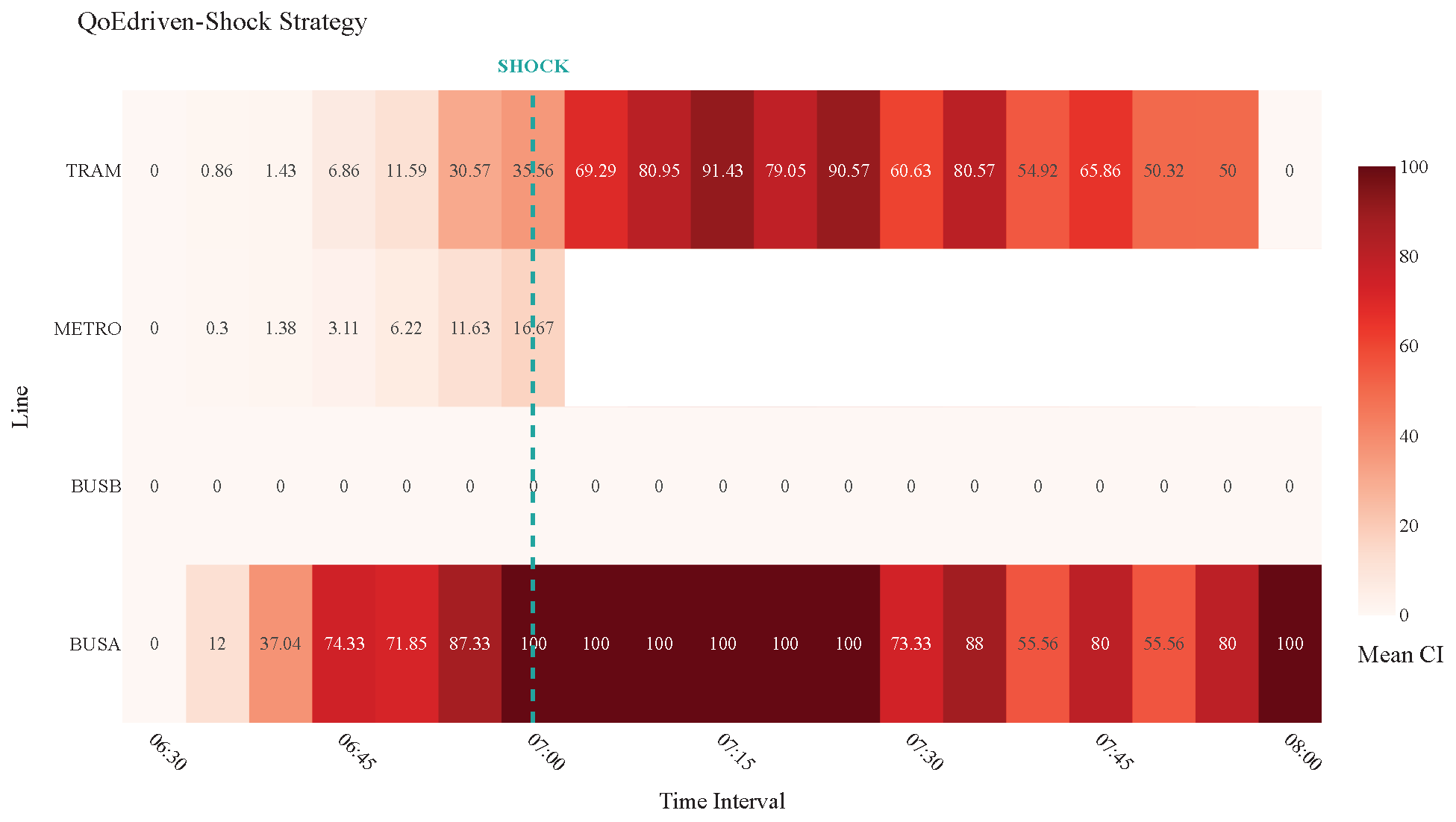The shock is implemented by completely removing the Metro line from service starting from 7:00 a.m. This specific timing was deliberately chosen because, as established in the baseline analysis, the demand distribution is Gaussian, with the peak departure rate occurring precisely at 7:00 a.m., thus ensuring that the maximum number of users are immediately displaced, forcing a rapid re-evaluation of routes and intensifying the stress on alternative services (Bus and Tram). Furthermore, the removal of the Metro line is the most impactful single-point failure, as it is the most frequent, and highest-capacity service, providing a stringent test of the system’s ability to re-route demand effectively under heavy pressure. To study the system’s adaptive capabilities during this failure, we compare the performance under two distinct operational strategies: the Balanced-Shock Scenario and the QoE-Shock Scenario.