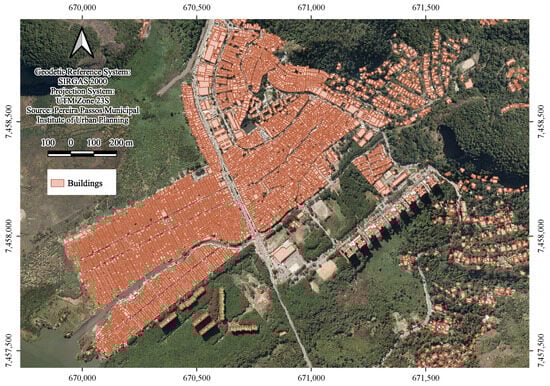 This study utilized the following vector-based geospatial data from the 2013 survey of Rio de Janeiro: building footprints—with altimetry (Figure 5) and hydrographic features, both derived from digital photogrammetric restitution at a 1:2000 scale. Additionally, orthoimages supported the vectorization of trees and vegetation, while a laser-scanned Digital Terrain Model (DTM) was incorporated to construct a 3D simulation model integrating buildings, vegetation, and rivers.