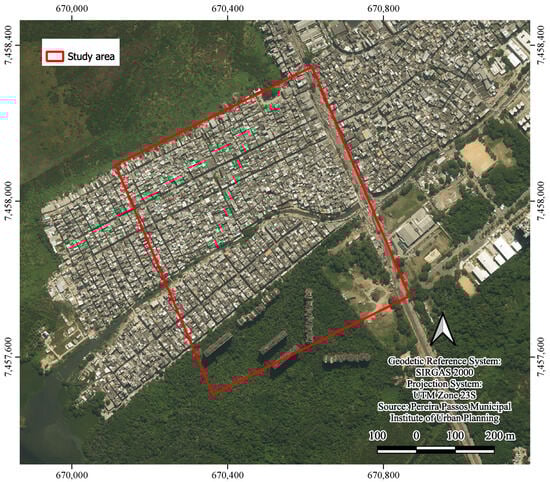 ENVI-met requires significant computational capacity to execute microclimatic simulations, as it analyzes different factors in an integrated manner []. The simulations were run on a Windows 11 PRO with an Intel Core i9-14900 processor with 24 cores up to 5.6 GHz, 64 GB of DDR5 5200MHz memory, and an NVIDIA RTX 4060 8 GB graphics card. Due to computational limitations, it was necessary to delimit the study area to a region of approximately 564 m × 639 m (Figure 8). The delimited area covers the entire Areal II locality, as well as part of Areal I and Areinha (see Figure 3 for reference), and its selection was based on being the region identified as the most delicate in the favela, where the highest number of ground sinkings and building collapses were reported. Additionally, the region borders the abandoned area of the Delfin Imobiliária Residential Complex, making the delimitation interesting due to the possibility of presenting a gradient in results between the favela and the vegetated area of the derelict condominium.