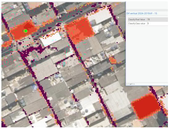 To simplify the data output, these subtracted values were rounded to integers, and the final raster presents values referring to vertical variation. In the representation of Figure 11, values between −2 and 2 m were discarded, as they do not constitute sufficient variation to justify the addition or reduction in a floor. The others, represented over the orthoimage, allow identifying which building had changes in its verticality. As an example, a building with a positive difference of 15 m was selected (i.e., between 2019 and 2024, there was an increase in height of about 15 m—evidencing a small building with 5 floors.