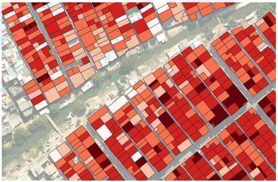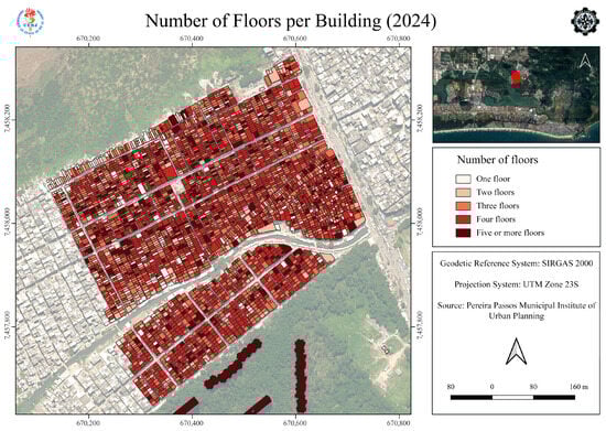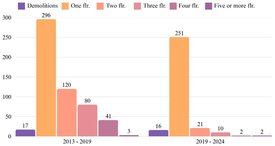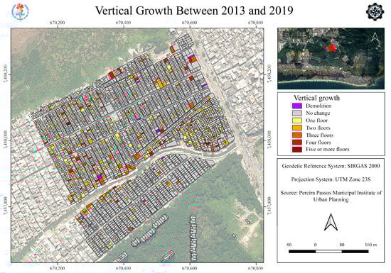 Using the “Zonal Statistics” tool from ArcGIS Pro, a summary by mode (the value that repeats most often in the dataset) was performed on the raster of vertical difference between 2019 and 2013, referring to each building polygon from the 2013 restitution. Thus, the most common pixel value (already discretized) within that polygon was chosen—representing, more clearly, the predominant vertical variation. The “TOPO” attribute value for 2019 resulted from the 2013 values, added to this vertical variation, to obtain the new height values for each building. For buildings without vertical variation, the difference should be close to zero (and discretized to zero). For significant vertical variations, values close to 3 m per floor, positive, can be considered. For demolitions, a negative result occurs. Additionally, new buildings, identified by positive results in previously empty areas (without polygons), were also added manually to the base through the QGIS vectorization tool (“Add polygon” tool). Table 1 shows how the relationship between height differences and the number of added floors between models was defined.