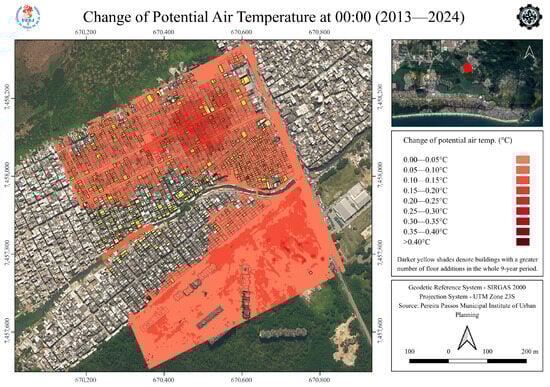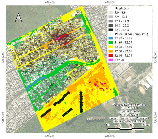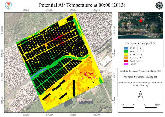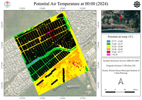 The ENVI-met simulation results presented here are for midnight. This time was chosen for two reasons. First, it standardizes the comparison, as the measured temperature data from the Jacarepaguá station was available at hourly intervals, including midnight. Second, analyzing conditions at midnight highlights the persistence of the Urban Heat Island (UHI) effect, demonstrating that it remains significant even when air temperatures are typically at their coolest.