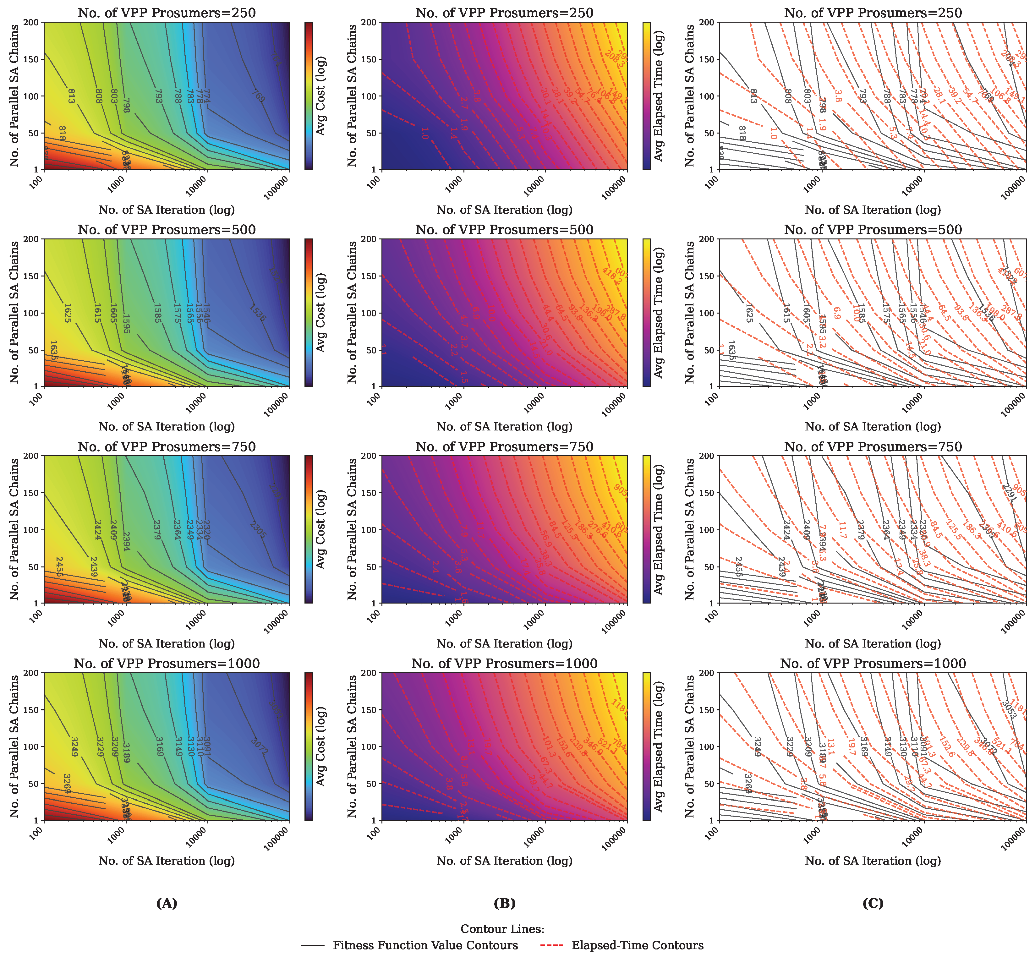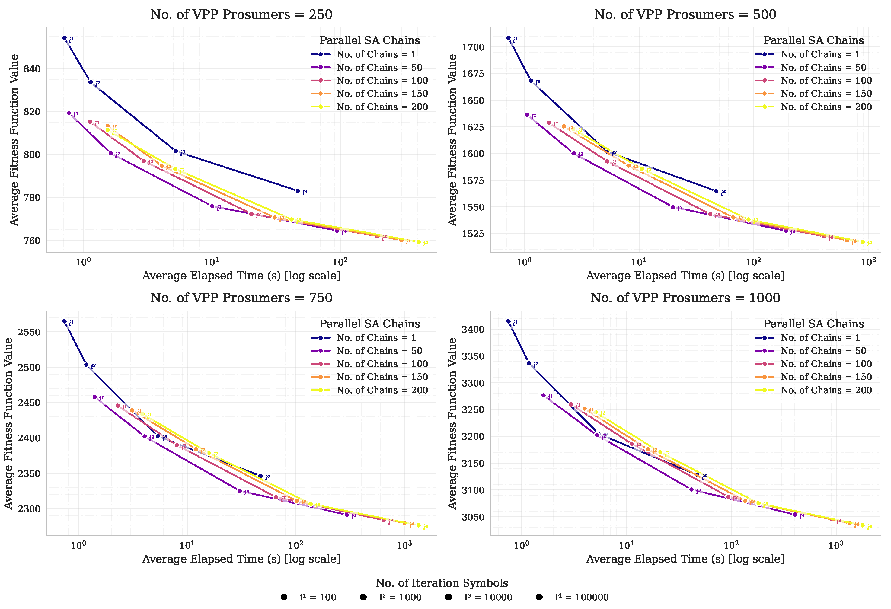 First, we observe consistent improvement in solution quality as either iterations or chains increase, confirming the expected trade-off between computational effort and optimization accuracy. This pattern holds true across all three VPP sizes tested (250, 500, and 1000 prosumers), indicating stable algorithmic behavior regardless of system scale.