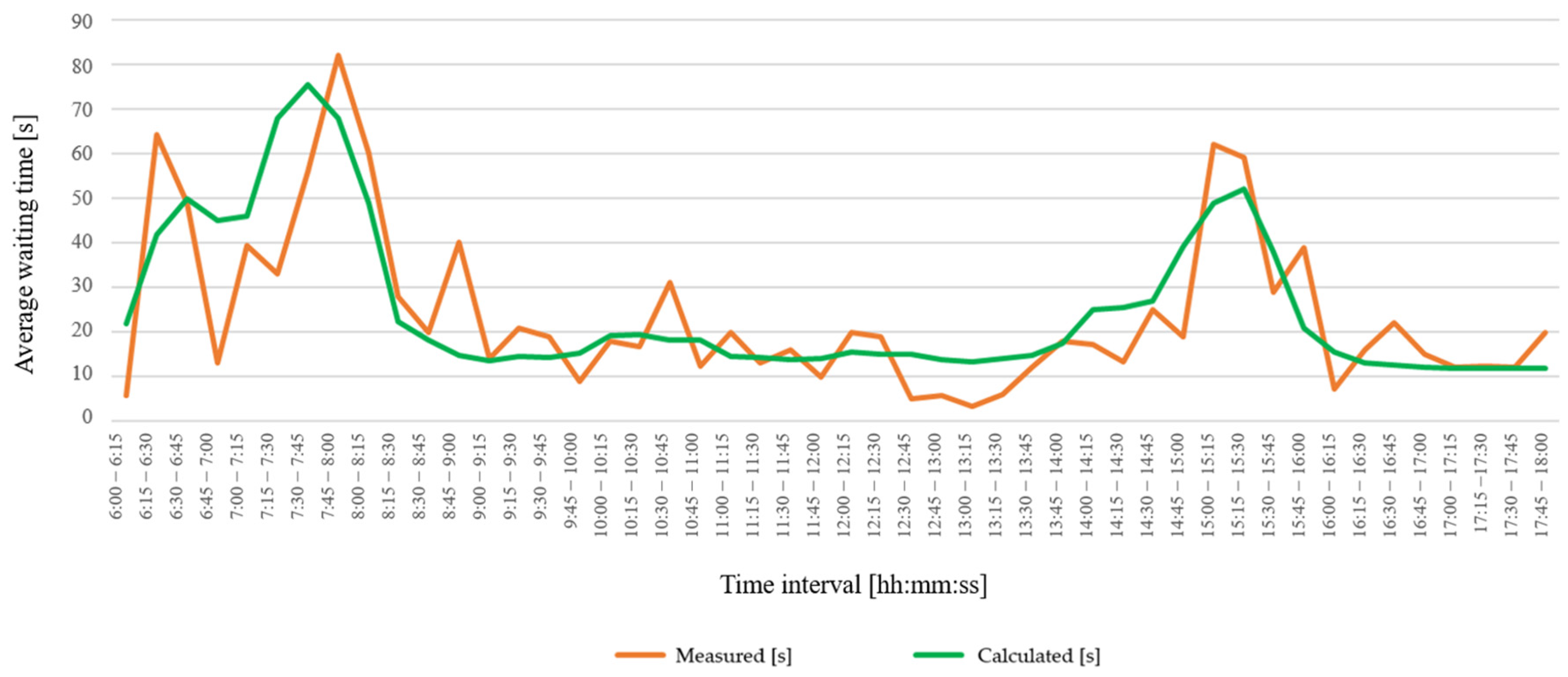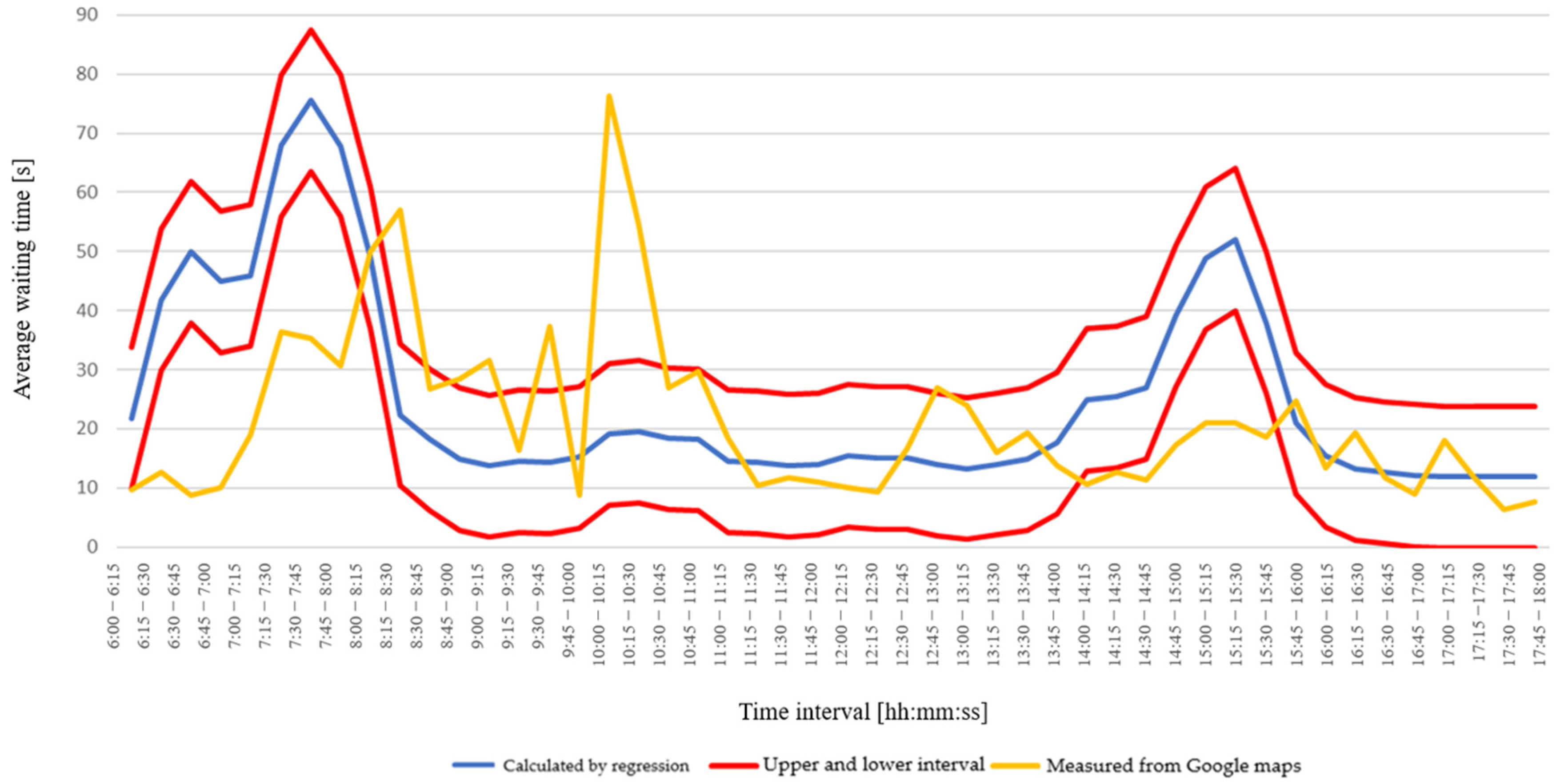 The graph clearly shows that during the morning and afternoon rush hour periods, the observed values (orange curve) are significantly higher than the average in other time intervals. The regression analysis (green curve) smooths these fluctuations and provides values that, in most intervals, are closer to real traffic operation than the standardized methodology. Deviations appear mainly in intervals with very high or very low waiting times, but the overall trend demonstrates that regression analysis can effectively eliminate extreme overestimations.