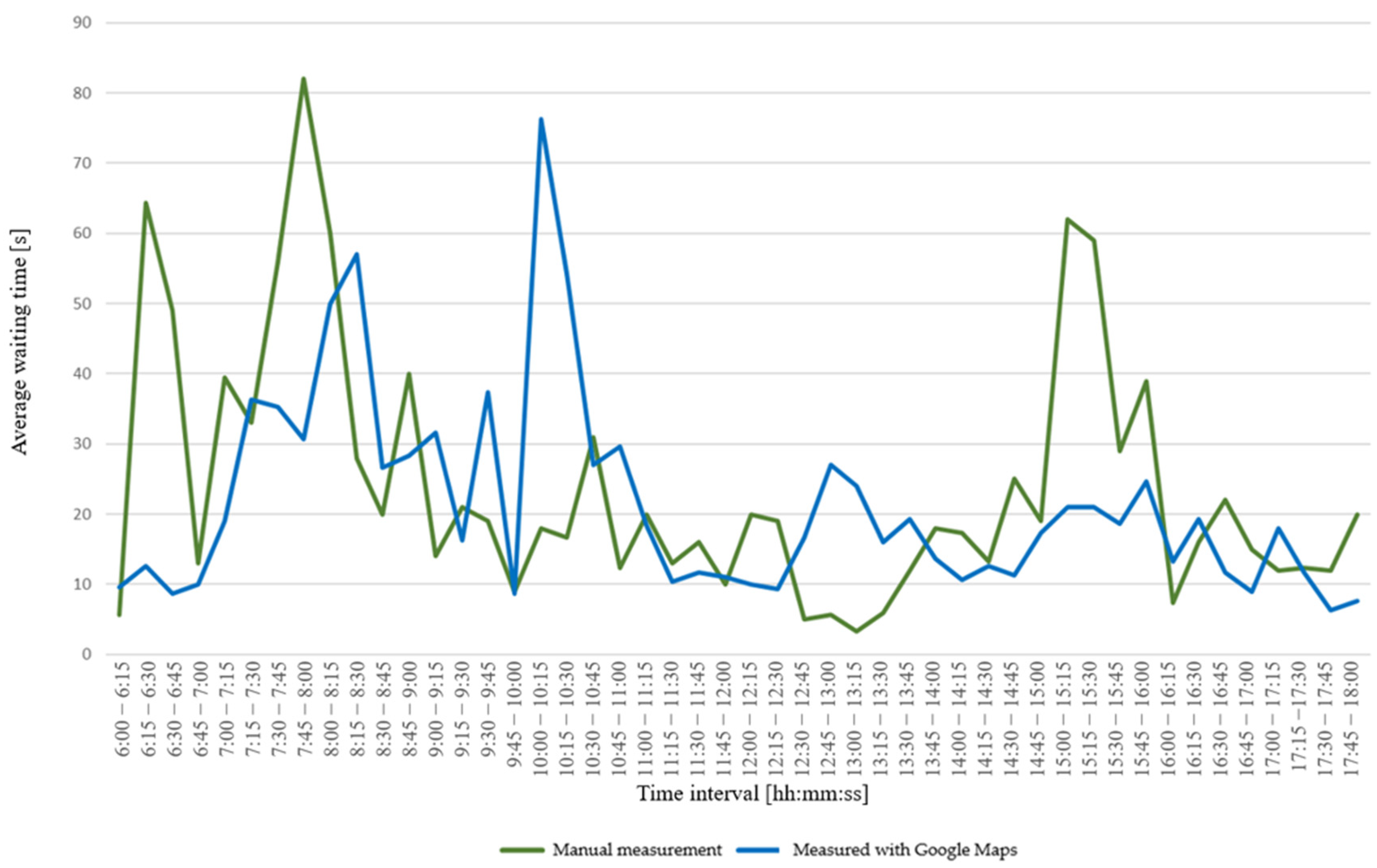 Figure 5. Comparison of waiting times in traffic flow 7 between the calculated time and the time measured by Google Maps.