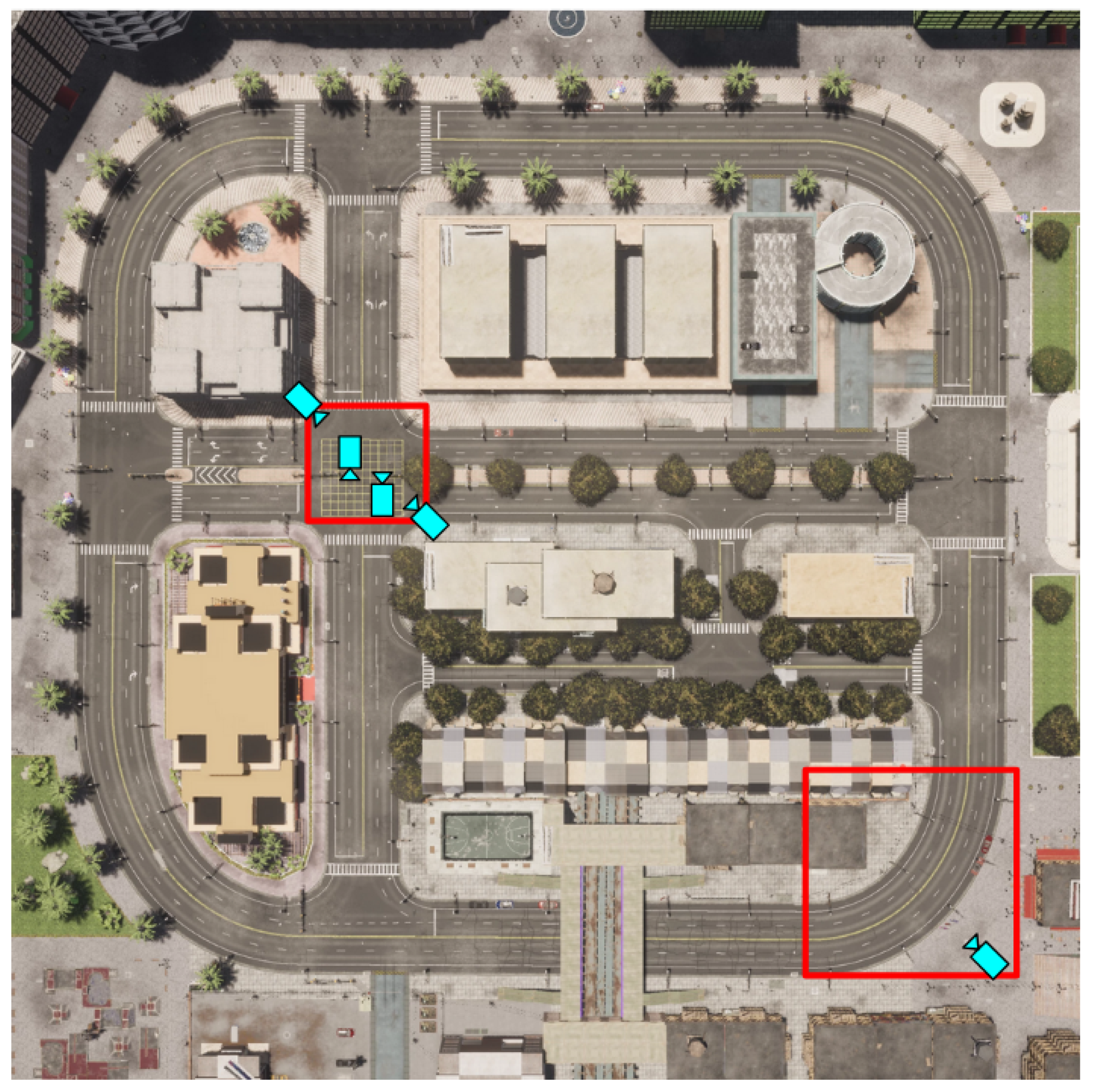 Intersection scenario: A four-way intersection equipped with four cameras placed at different angles to cover all directions as illustrated in