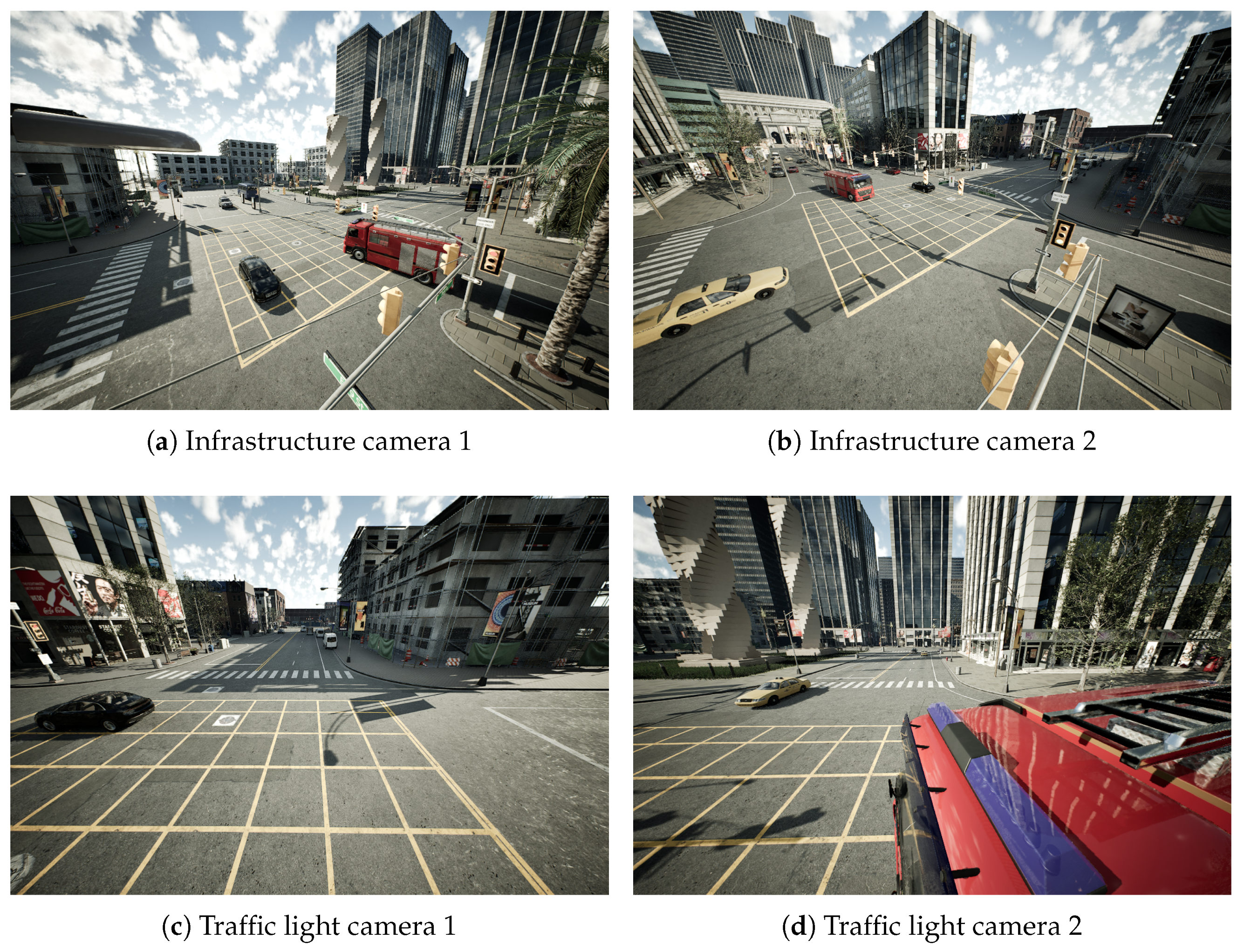 A total of five cameras were deployed in CARLA, each configured with a resolution of 1280 × 720 pixels and a 120° field of view (FoV), ensuring extensive coverage of the selected scenarios.