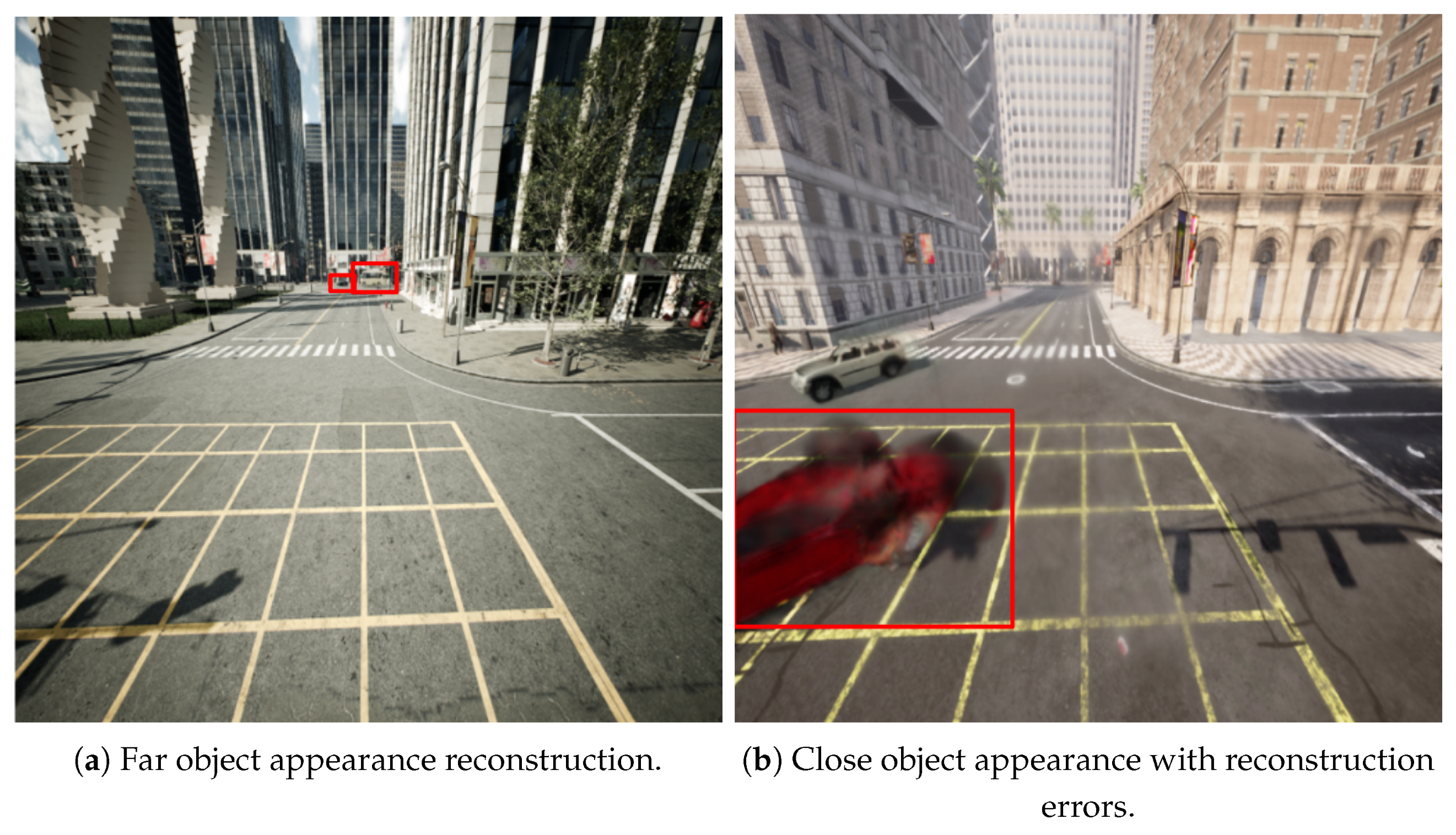 cannot perfectly replicate the ground-truth pixels, the accumulation of minor reconstruction error on irrelevant regions (i.e., buildings, road surface, distant objects) degraded the accuracy of anomaly detection, despite these areas not being crucial to distinguish normal from anomalous situations.