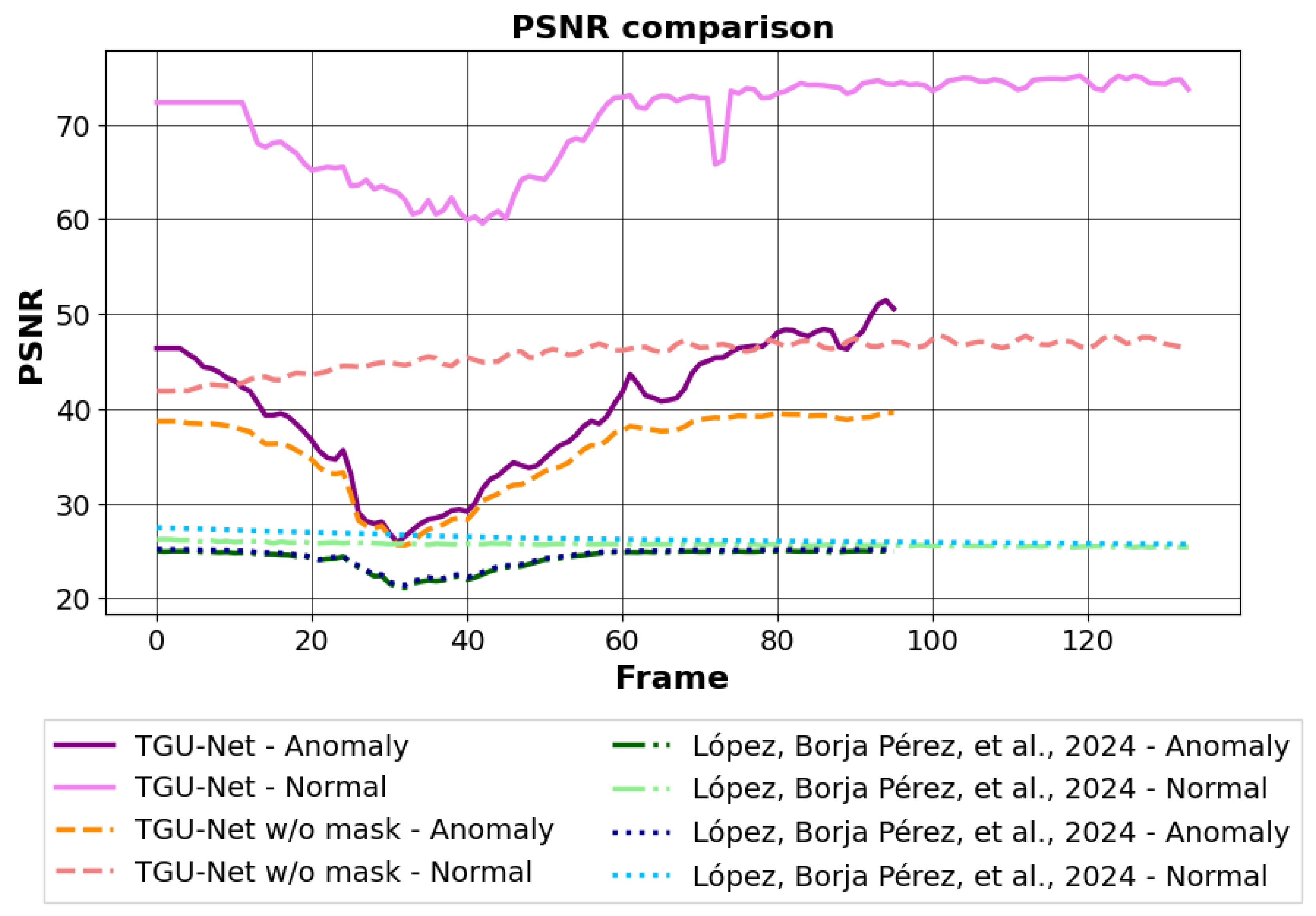 values, but it also maintains a well-defined separation between the two categories. Specifically, the large separation between the TGU-Net masked and the TGU-Net without mask lines demonstrates the efficacy of the masking strategy in suppressing background noise and achieving metric stability in normal scenes, a key justification for its superiority over not masked evaluation.In contrast, models on [