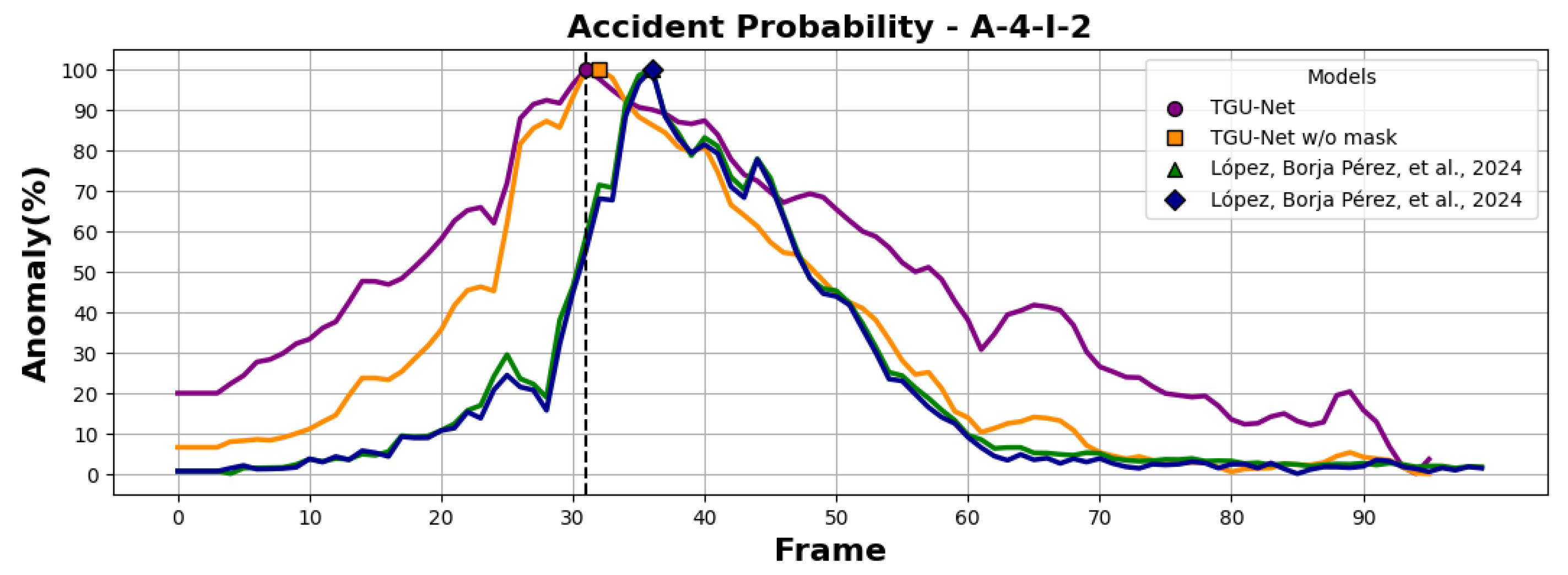 Figure 9, in the A-4-L-3 scenario all models converge around frame 30. However, TGU-Net and its unmasked variant reach full confidence earlier. Notably, the TGU-Net achieves 100% detection confidence precisely at the anomalous frame, as marked by the dotted horizontal line.