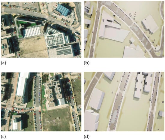 Comparison of selected streets in the experimental area between ArcGIS satellite imagery and CARLA virtual maps. (a) ArcGIS satellite imagery. (b) Virtual map in CARLA. (c) ArcGIS satellite imagery. (d) Virtual map in CARLA.