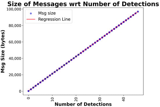 Figure 8 illustrates the relationship between the size of the transmitted message and the number of detections contained within it. As expected, a near-perfect linear correlation is observed, which can be expressed mathematically as follows:
